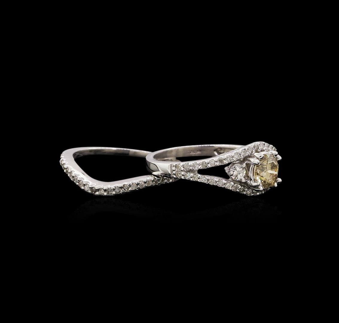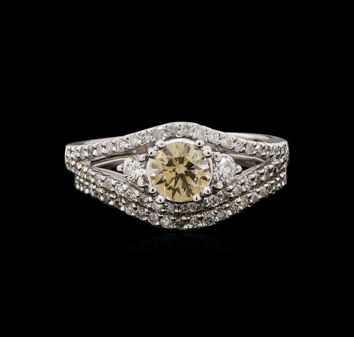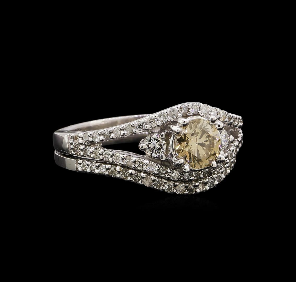 One electronically tested 14KT white gold ladies cast diamond engagement ring & guard with a bright polish finish. Condition is new. Containing: One prong set round brilliant cut diamond, measuring 5.95 - 5.50 x 3.44mm (depth est.) approximate weight of 0.69ct. Clarity: SI-2, Cut is Good. Two prong set round brilliant cut diamonds, measuring 2.50 - 2.50 x 1.50mm (depth est.) approximate total weight of 2 Stones = 0.11ct. Clarity: SI-1. Color: K, Cut is Good. Sixty-Five prong set round brilliant cut diamonds, measuring 1.30 - 1.30 x 0.78mm (depth est.) approximate total weight of 65 Stones = 0.52ct. Clarity: I-2. Color: J - K. All diamonds are graded in the mounting, unless otherwise stated. Total Weight of Diamonds 1.32ct. Total Weight of Engagement Ring & Guard 5.70 grams. GGL Appraised at $4,345.00.