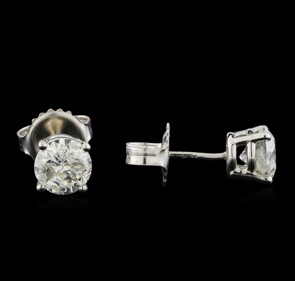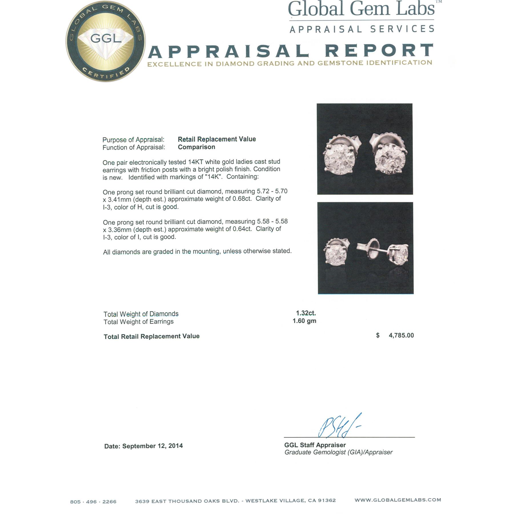One pair electronically tested 14KT white gold ladies cast stud earrings with friction posts with a bright polish finish. Identified with markings of "14K". Condition is new. Containing: One prong set round brilliant cut diamond, measuring 5.72 - 5.70 x 3.41mm (depth est.) approximate weight of 0.68ct. Clarity: I-3. Color: H, Cut is Good. One prong set round brilliant cut diamond, measuring 5.58 - 5.58 x 3.36mm (depth est.) approximate weight of 0.64ct. Clarity: I-3. Color: I, Cut is Good. All diamonds are graded in the mounting, unless otherwise stated total weight of Diamonds 1.32ct. Total Weight of Earrings 1.60 grams. GGL Appraised at $4,785.00.