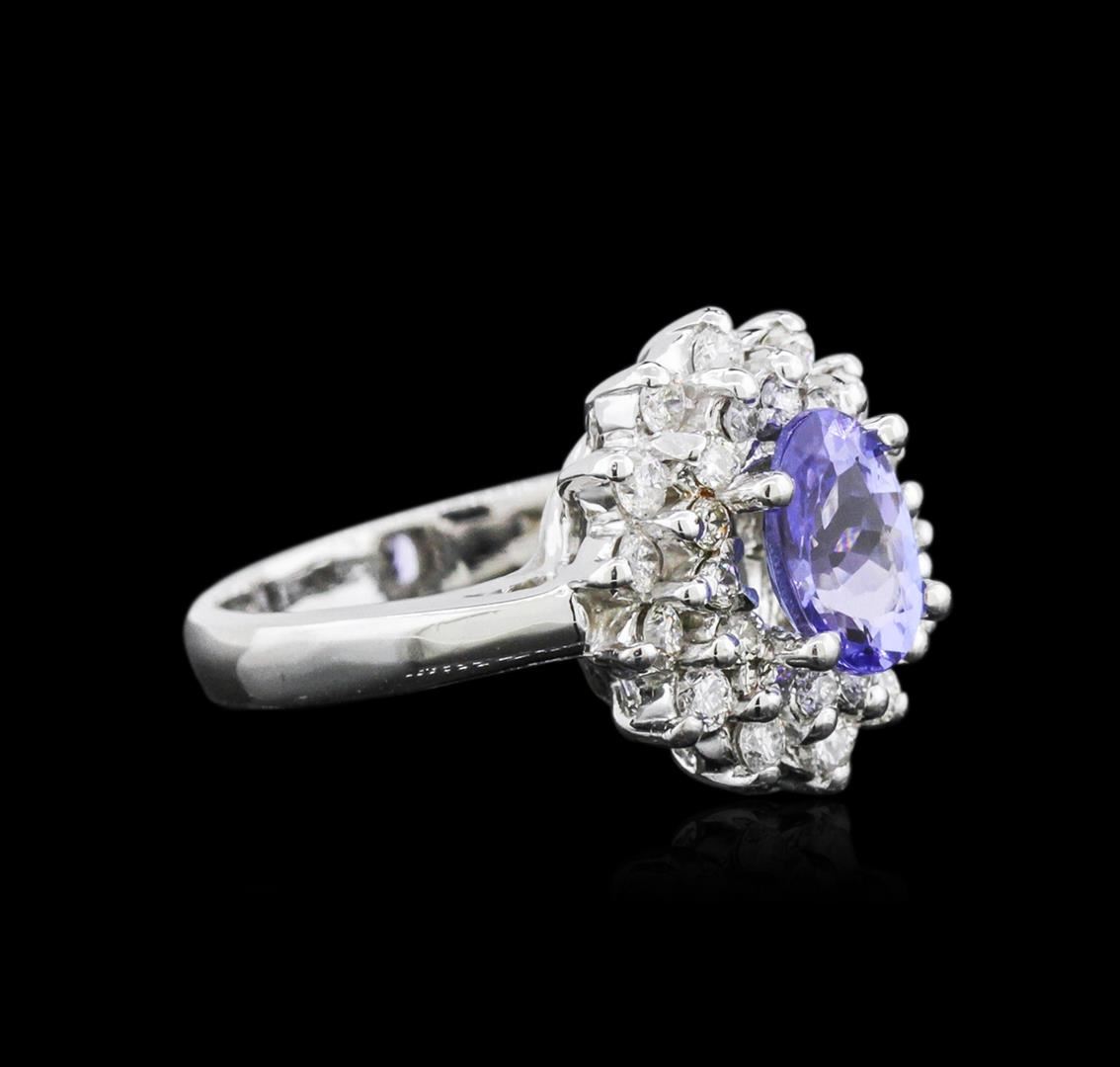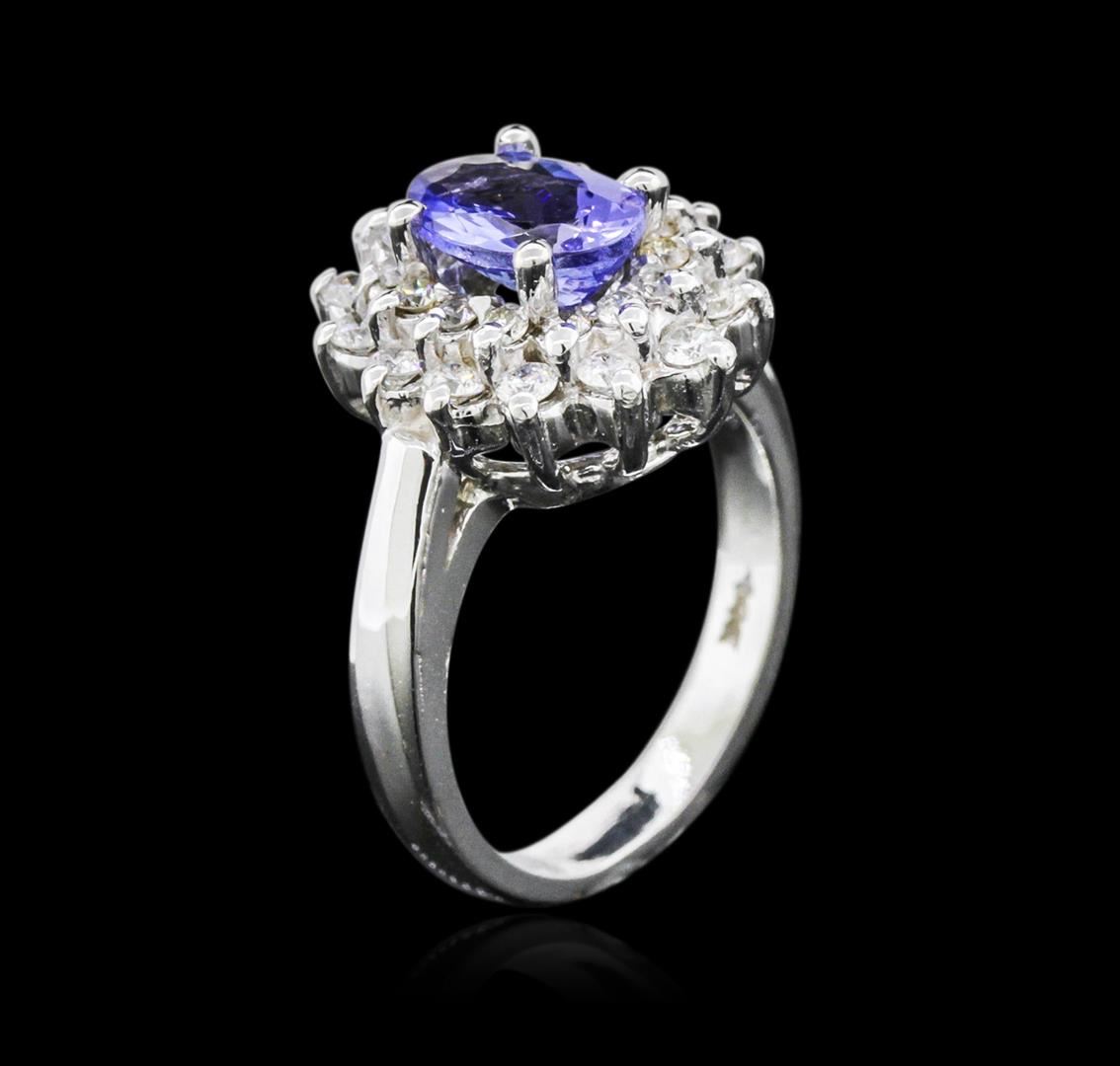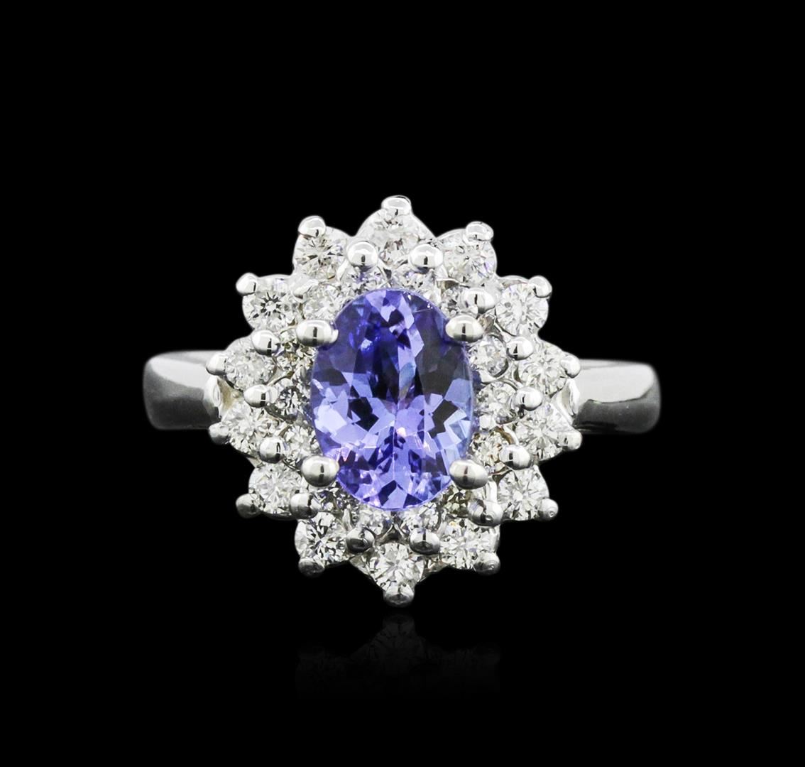 One electronically tested 14KT white gold ladies cast tanzanite and diamond ring with a bright polish finish. Identified with markings of "14K". Condition is new. Containing: One prong set oval modified brilliant cut natural tanzanite, measuring 8.00 x 6.00 x 3.90mm, approximate weight of 1.32ct., clarity is eye clean, type I, medium light, very slightly grayish, violet color, (GIA V 4/3), cut is good. Twenty-Seven prong set round brilliant cut diamonds, measuring 1.80 - 1.50 x 0.99mm (depth est.) approximate total weight of 27 Stones = 0.44ct. Clarity: SI-1 to SI-2. Color: H - I, Cut is Good. Colored gemstones are presumed to have been subjected to commonly used enhancement processes. All diamonds and colored gemstones are graded in the mounting, unless otherwise stated. Total Weight of Colored Stones 1.32ct. Total Weight of Diamonds 0.44ct. Total Weight of Ring 6.20 grams. GGL Appraised at $3,765.00.