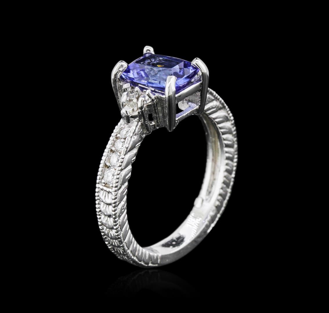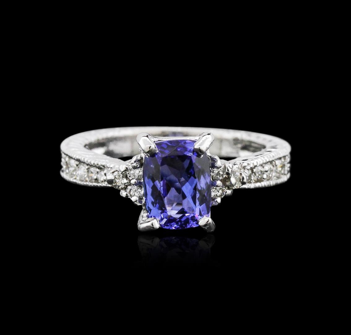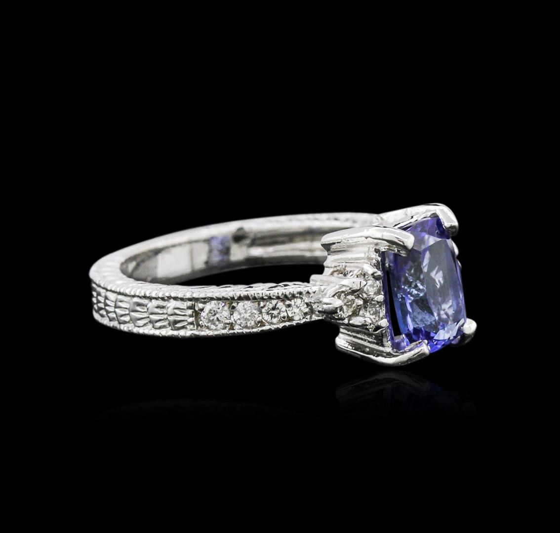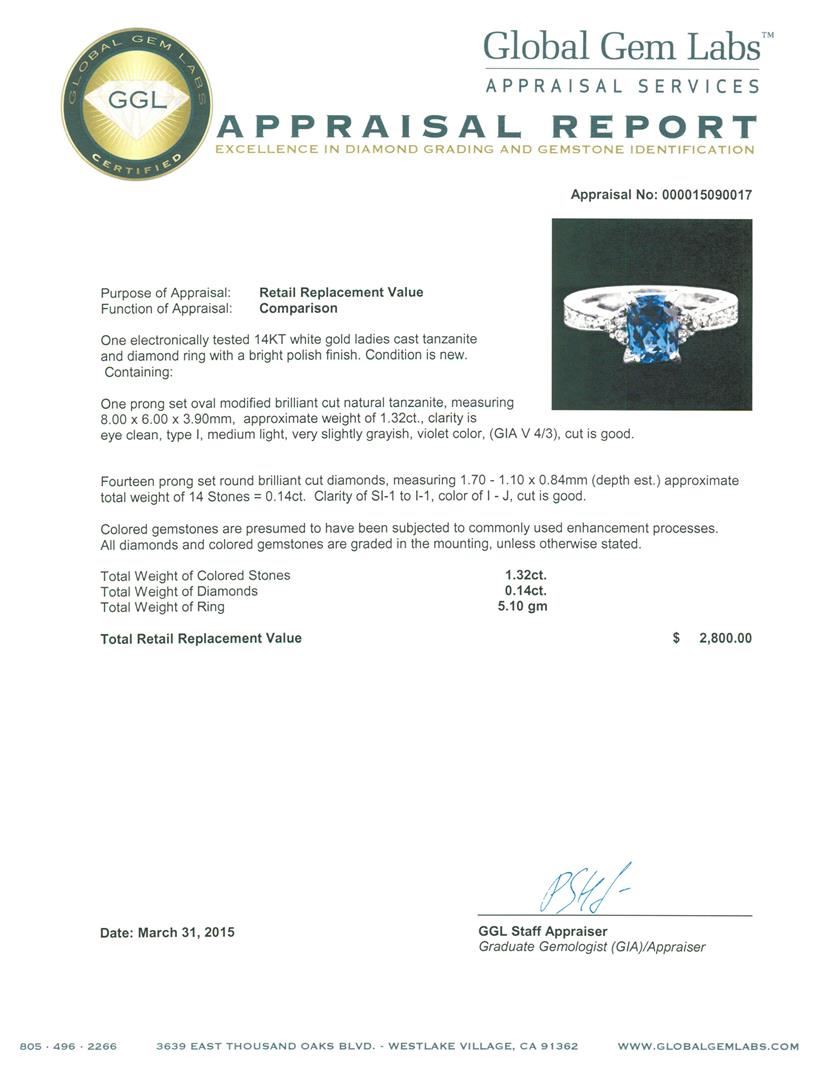 One electronically tested 14KT white gold ladies cast tanzanite and diamond ring with a bright polish finish. Condition is new. Containing: One prong set oval modified brilliant cut natural tanzanite, measuring 8.00 x 6.00 x 3.90mm, approximate weight of 1.32ct., clarity is eye clean, type I, medium light, very slightly grayish, violet color, (GIA V 4/3), cut is good. Fourteen prong set round brilliant cut diamonds, measuring 1.70 - 1.10 x 0.84mm (depth est.) approximate total weight of 14 Stones = 0.14ct. Clarity: SI-1 to I-1. Color: I - J, Cut is Good. Colored gemstones are presumed to have been subjected to commonly used enhancement processes. All diamonds and colored gemstones are graded in the mounting, unless otherwise stated. Total Weight of Colored Stones 1.32ct. Total Weight of Diamonds 0.14ct. Total Weight of Ring 5.10 grams. GGL Appraised at $2,800.00.