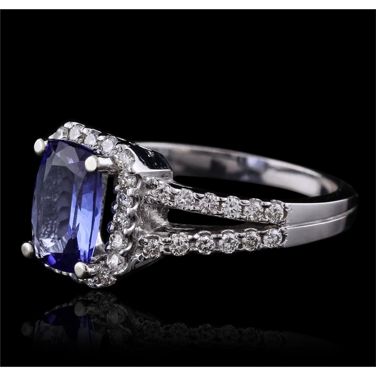 One electronically tested 14KT white gold Ladies cast ring with a bright polish finish. Condition is new. Identified with markings of "14K". Containing: One prong set rectangular cushion modified brilliant cut natural tanzanite, measuring 8.90 x 6.00 x 3.15mm, approximate weight of 1.32ct., clarity is eye clean, type I, medium light, very slightly grayish, violet color, (GIA V 4/3), cut is good. Forty-Four prong set round brilliant cut diamonds, measuring 1.40 - 1.40 x 0.84mm (depth est.) approximate. Total Weight of 44 Stones = 0.44ct. Clarity: I-1 to I-2. Color: I - J, Cut is Good. Colored gemstones are presumed to have been subjected to commonly used enhancement processes. All diamonds and colored gemstones are graded in the mounting, unless otherwise stated. Total Weight of Colored Stones 1.32ct. Total Weight of Diamonds 0.44ct. Total Weight of Ring 4.60 grams. GGL Appraised at $4,365.00.