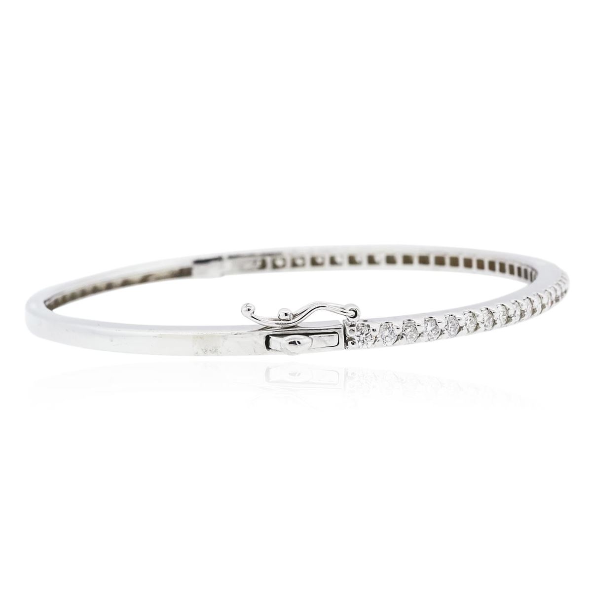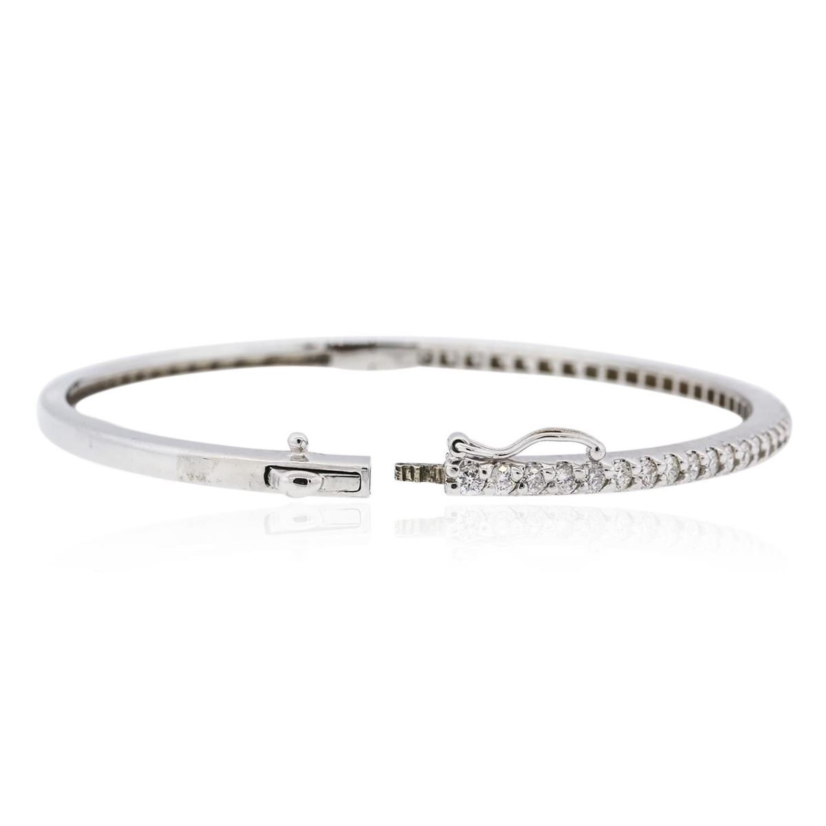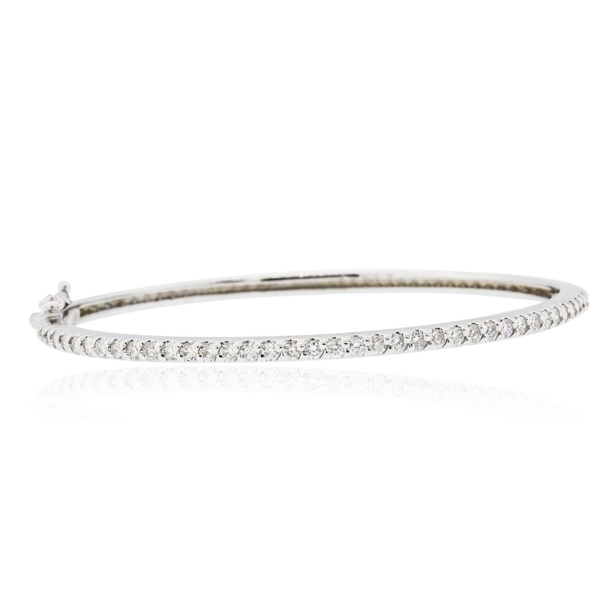 One electronically tested 14KT white gold ladies cast diamond bangle bracelet with a hidden box clasp with a bright polish finish. Identified with markings of "14K". Condition is new. Containing: Thirty-Nine prong set round brilliant cut diamonds, measuring 2.10 - 2.10 x 1.26mm (depth est.) approximate total weight of 39 Stones = 1.32ct. Clarity: SI-2 to I-1. Color: I - J, Cut is Good. All diamonds are graded in the mounting, unless otherwise stated. Total Weight of Diamonds 1.32ct. Total Weight of Bangle Bracelet 11.50 grams. GGL Appraised at $4,945.00.
