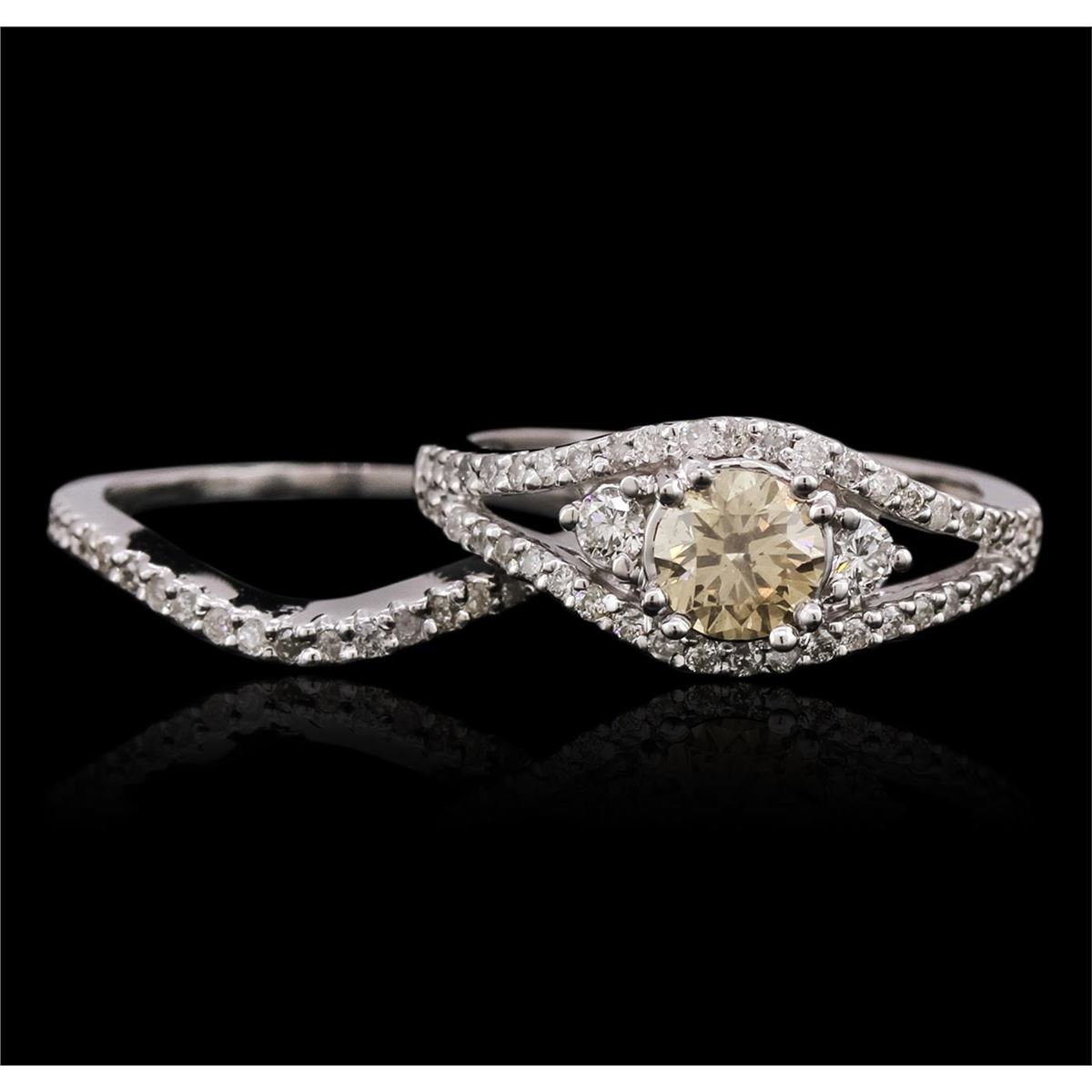 One electronically tested 14KT white gold ladies cast diamond engagement ring & guard with a bright polish finish. Condition is new. Containing: One prong set round brilliant cut diamond, measuring 5.95 - 5.50 x 3.44mm (depth est.) approximate weight of 0.69ct. Clarity: SI-2, Cut is Good. Two prong set round brilliant cut diamonds, measuring 2.50 - 2.50 x 1.50mm (depth est.) approximate total weight of 2 Stones = 0.11ct. Clarity: SI-1. Color: K, Cut is Good. Sixty-Five prong set round brilliant cut diamonds, measuring 1.30 - 1.30 x 0.78mm (depth est.) approximate total weight of 65 Stones = 0.52ct. Clarity: I-2. Color: J - K. All diamonds are graded in the mounting, unless otherwise stated. Total Weight of Diamonds 1.32ct. Total Weight of Engagement Ring & Guard 5.70 grams. GGL Appraised at $4,345.00.