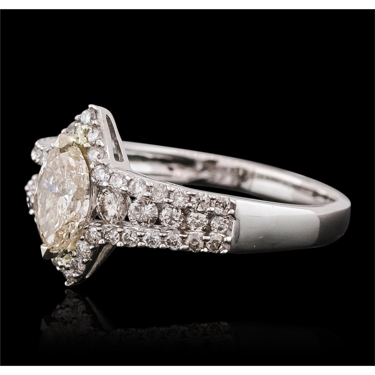 One electronically tested 14KT white gold ladies cast & assembled diamond unity ring with a bright polish finish. The featured diamond is set within mirroring diamond ribbons supported by diamond set shoulders, completed by a two millimeter wide band. Trademark is Orianne. Identified with markings of "14K". Condition is new, good workmanship. Containing: One prong set marquise shaped cut diamond, measuring 7.30 x 4.85 x 3.20mm (depth est.), 5.00.%. GTCF approximate weight of 0.79ct with a faint blue fluorescence. Graded in the setting. Clarity: I-1. Depth: 66.0%. Table 63.9%. Forty-Eight prong set round brilliant cut diamonds (depth est.) approximate total weight of 48 Stones = 0.53ct. Faint brown secondary color throughout. Graded in the setting. Clarity: SI-1 to I-1. Color: H - J. Total Weight of Diamonds 1.32ct. Total Weight of Unity Ring 2.78 grams. AIG Appraised at $5,080.00.