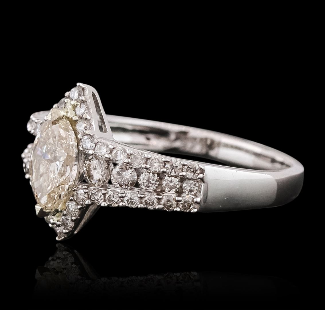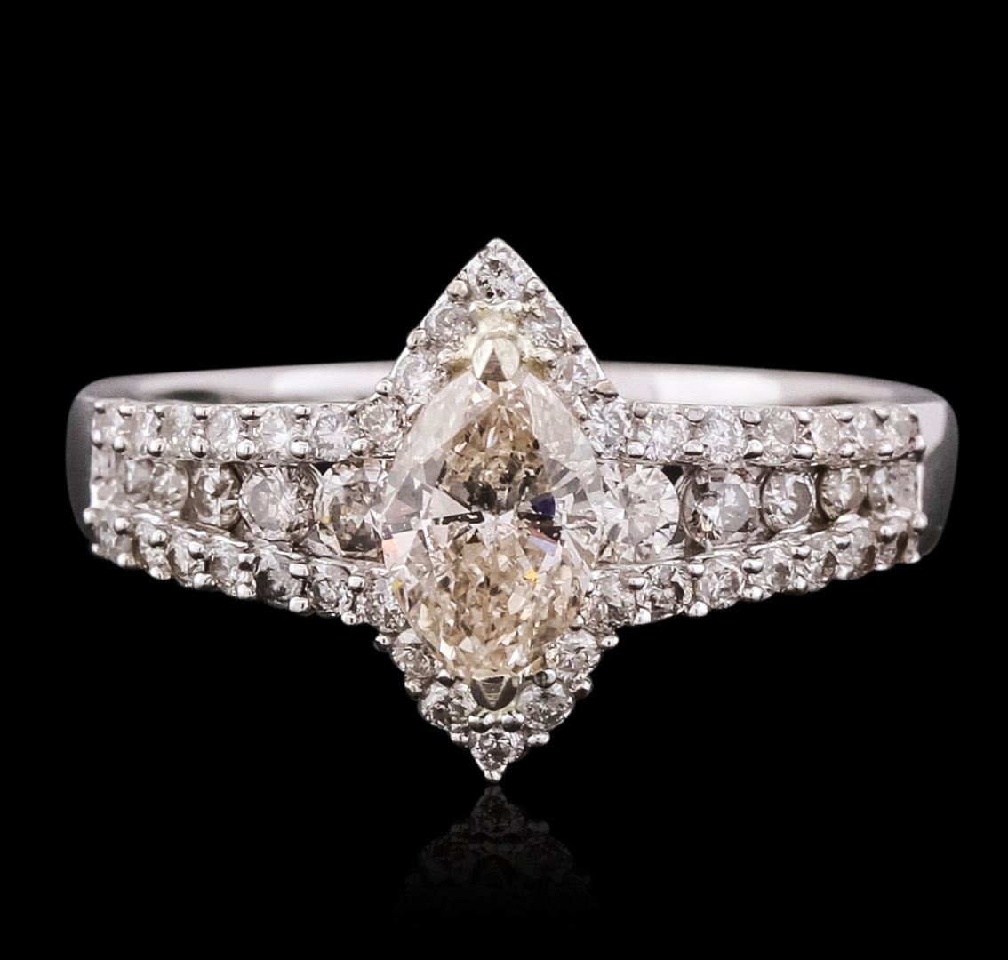 One electronically tested 14KT white gold ladies cast & assembled diamond unity ring with a bright polish finish. The featured diamond is set within mirroring diamond ribbons supported by diamond set shoulders, completed by a two millimeter wide band. Trademark is Orianne. Identified with markings of "14K". Condition is new, good workmanship. Containing: One prong set marquise shaped cut diamond, measuring 7.30 x 4.85 x 3.20mm (depth est.), 5.00.%. GTCF approximate weight of 0.79ct with a faint blue fluorescence. Graded in the setting. Clarity: I-1. Depth: 66.0%. Table 63.9%. Forty-Eight prong set round brilliant cut diamonds (depth est.) approximate total weight of 48 Stones = 0.53ct. Faint brown secondary color throughout. Graded in the setting. Clarity: SI-1 to I-1. Color: H - J. Total Weight of Diamonds 1.32ct. Total Weight of Unity Ring 2.78 grams. AIG Appraised at $5,080.00.