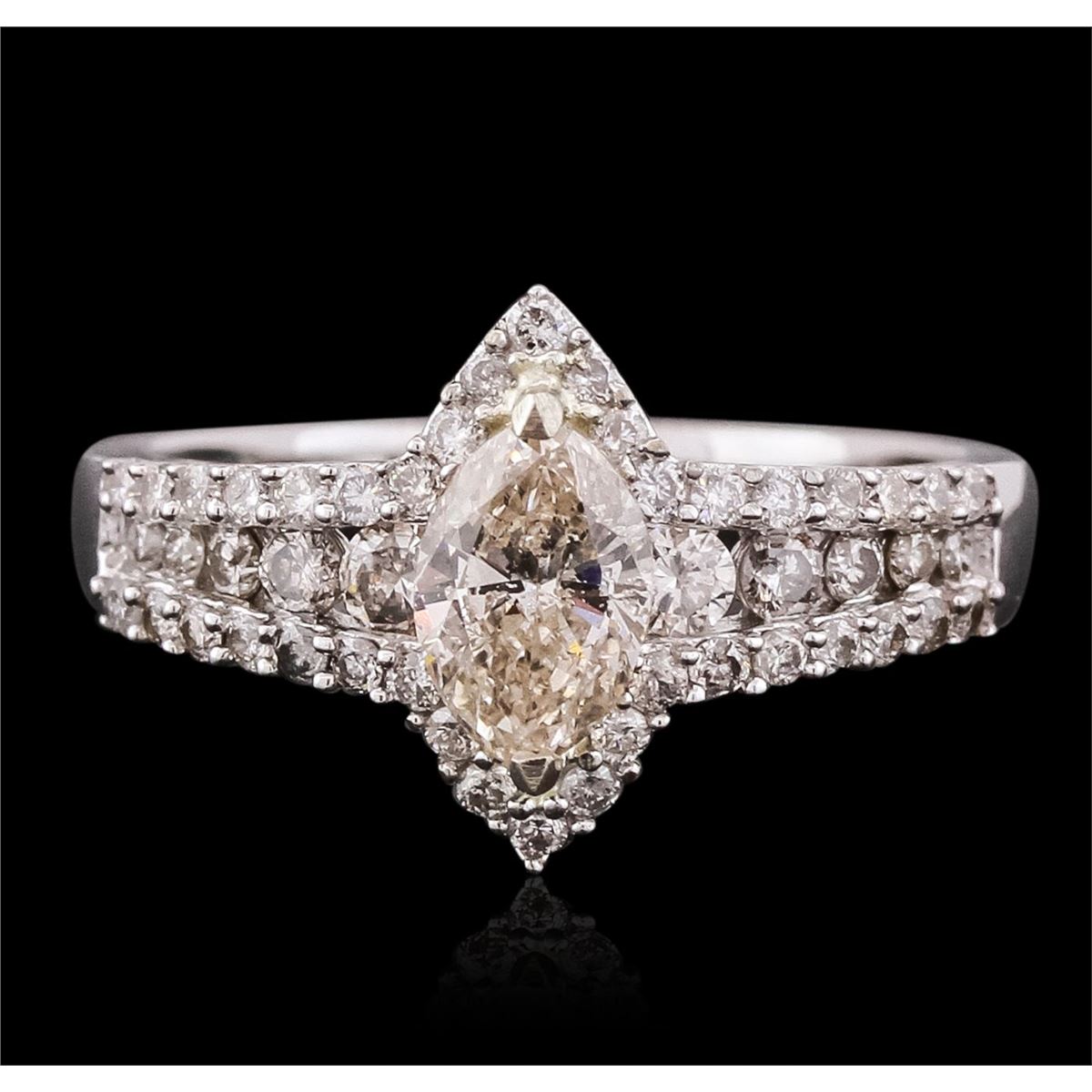 One electronically tested 14KT white gold ladies cast & assembled diamond unity ring with a bright polish finish. The featured diamond is set within mirroring diamond ribbons supported by diamond set shoulders, completed by a two millimeter wide band. Trademark is Orianne. Identified with markings of "14K". Condition is new, good workmanship. Containing: One prong set marquise shaped cut diamond, measuring 7.30 x 4.85 x 3.20mm (depth est.), 5.00.%. GTCF approximate weight of 0.79ct with a faint blue fluorescence. Graded in the setting. Clarity: I-1. Depth: 66.0%. Table 63.9%. Forty-Eight prong set round brilliant cut diamonds (depth est.) approximate total weight of 48 Stones = 0.53ct. Faint brown secondary color throughout. Graded in the setting. Clarity: SI-1 to I-1. Color: H - J. Total Weight of Diamonds 1.32ct. Total Weight of Unity Ring 2.78 grams. AIG Appraised at $5,080.00.