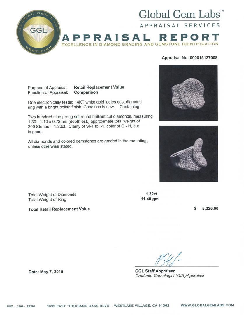 One electronically tested 14KT white gold ladies cast diamond ring with a bright polish finish. Condition is new. Containing: Two Hundred Nine prong set round brilliant cut diamonds, measuring 1.30 - 1.10 x 0.72mm (depth est.) approximate total weight of 209 Stones = 1.32ct. Clarity: SI-1 to I-1. Color: G - H, Cut is Good. All diamonds and colored gemstones are graded in the mounting, unless otherwise stated. Total Weight of Diamonds 1.32ct. Total Weight of Ring 11.40 grams. GGL Appraised at $5,325.00.