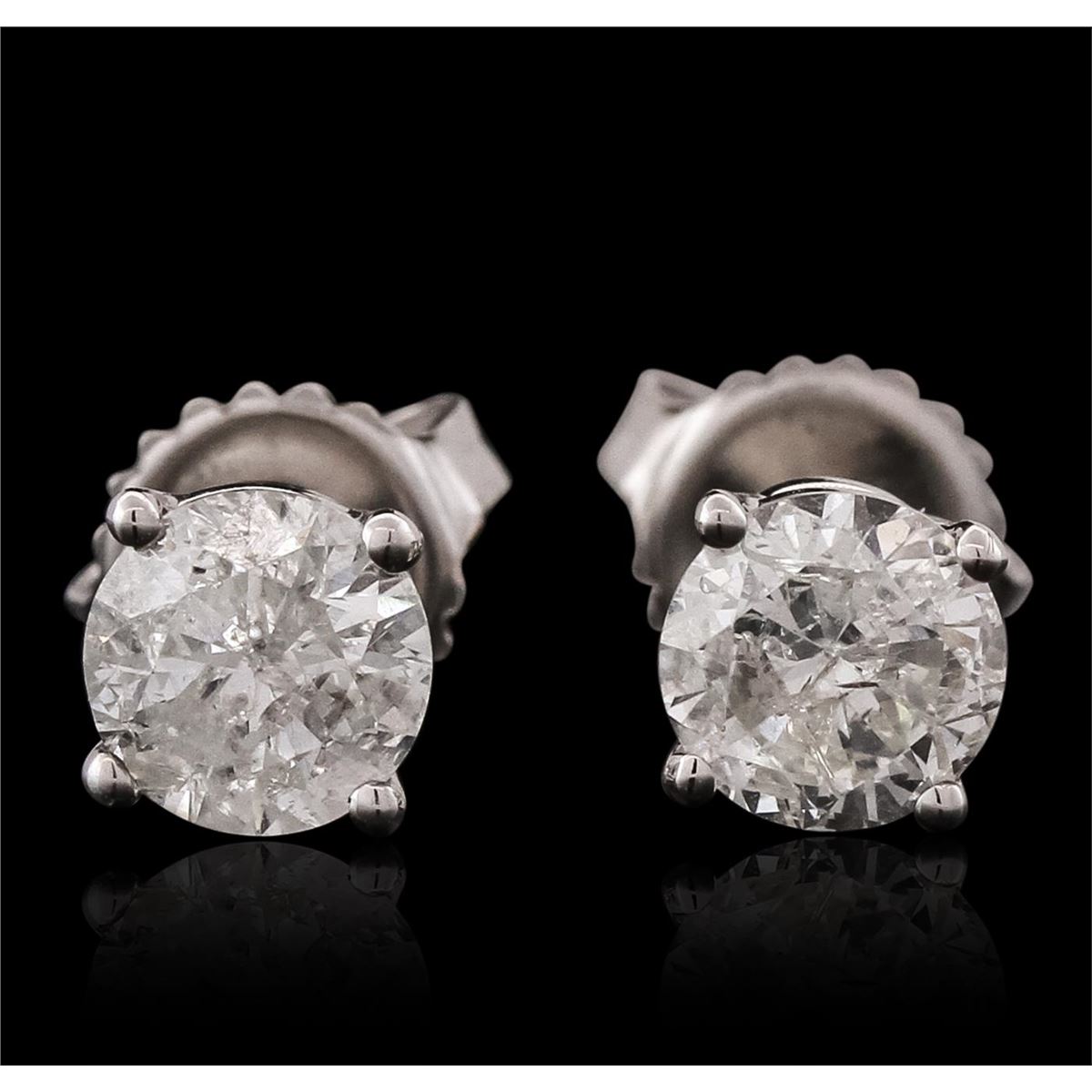 One pair electronically tested 14KT white gold ladies cast stud earrings with friction posts with a bright polish finish. Identified with markings of "14K". Condition is new. Containing: One prong set round brilliant cut diamond, measuring 5.72 - 5.70 x 3.41mm (depth est.) approximate weight of 0.68ct. Clarity: I-3. Color: H, Cut is Good. One prong set round brilliant cut diamond, measuring 5.58 - 5.58 x 3.36mm (depth est.) approximate weight of 0.64ct. Clarity: I-3. Color: I, Cut is Good. All diamonds are graded in the mounting, unless otherwise stated total weight of Diamonds 1.32ct. Total Weight of Earrings 1.60 grams. GGL Appraised at $4,785.00.