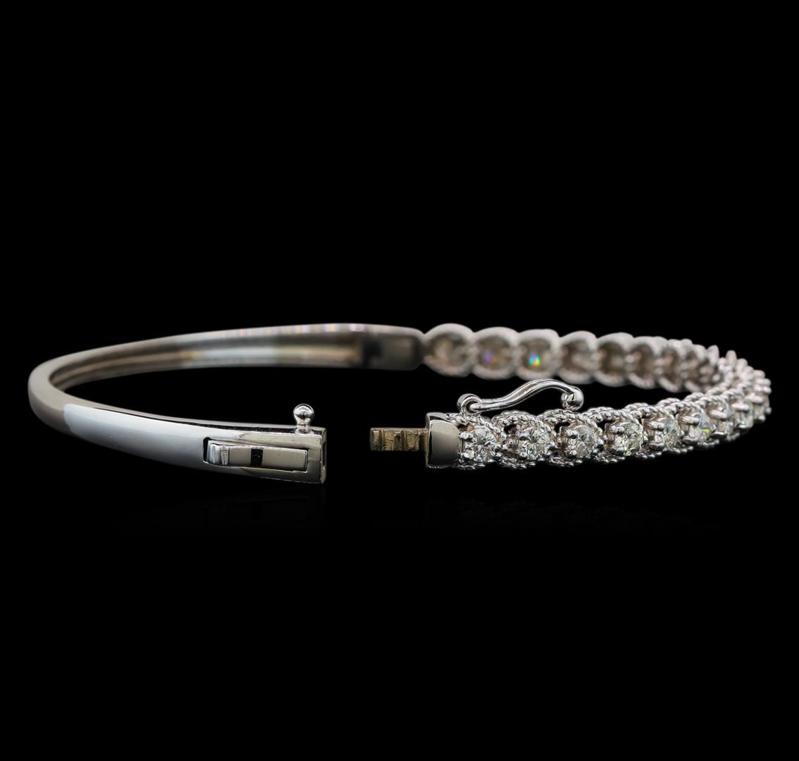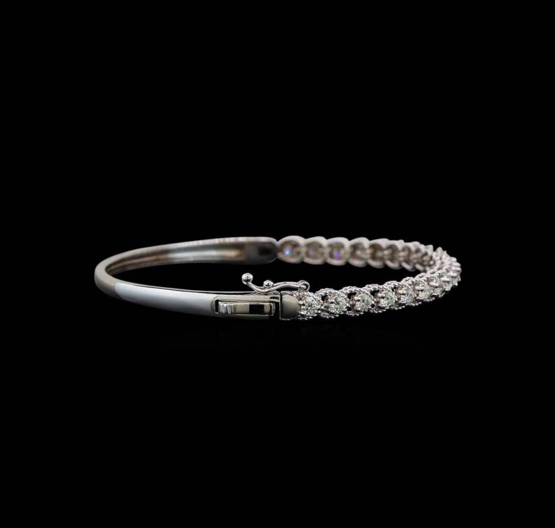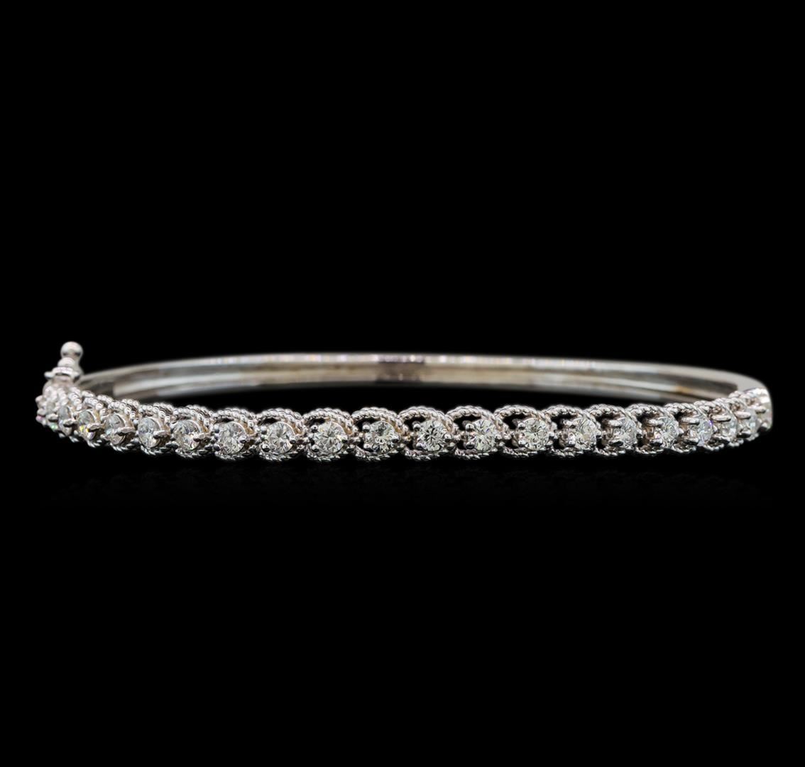 One electronically tested 14KT white gold ladies cast diamond bangle bracelet with a hidden box clasp with safety closer with a bright polish finish. Identified with markings of "14K". Condition is new. Containing: Twenty-One prong set round brilliant cut diamonds, measuring 2.50 - 2.50 x 1.50mm (depth est.) approximate total weight of 21 Stones = 1.33ct. Clarity: SI-1 to SI-2. Color: G - H, Cut is Good. All diamonds are graded in the mounting, unless otherwise stated. Total Weight of Diamonds 1.33ct. Total Weight of Bangle Bracelet 10.40 grams. GGL Appraised at $4,785.00.