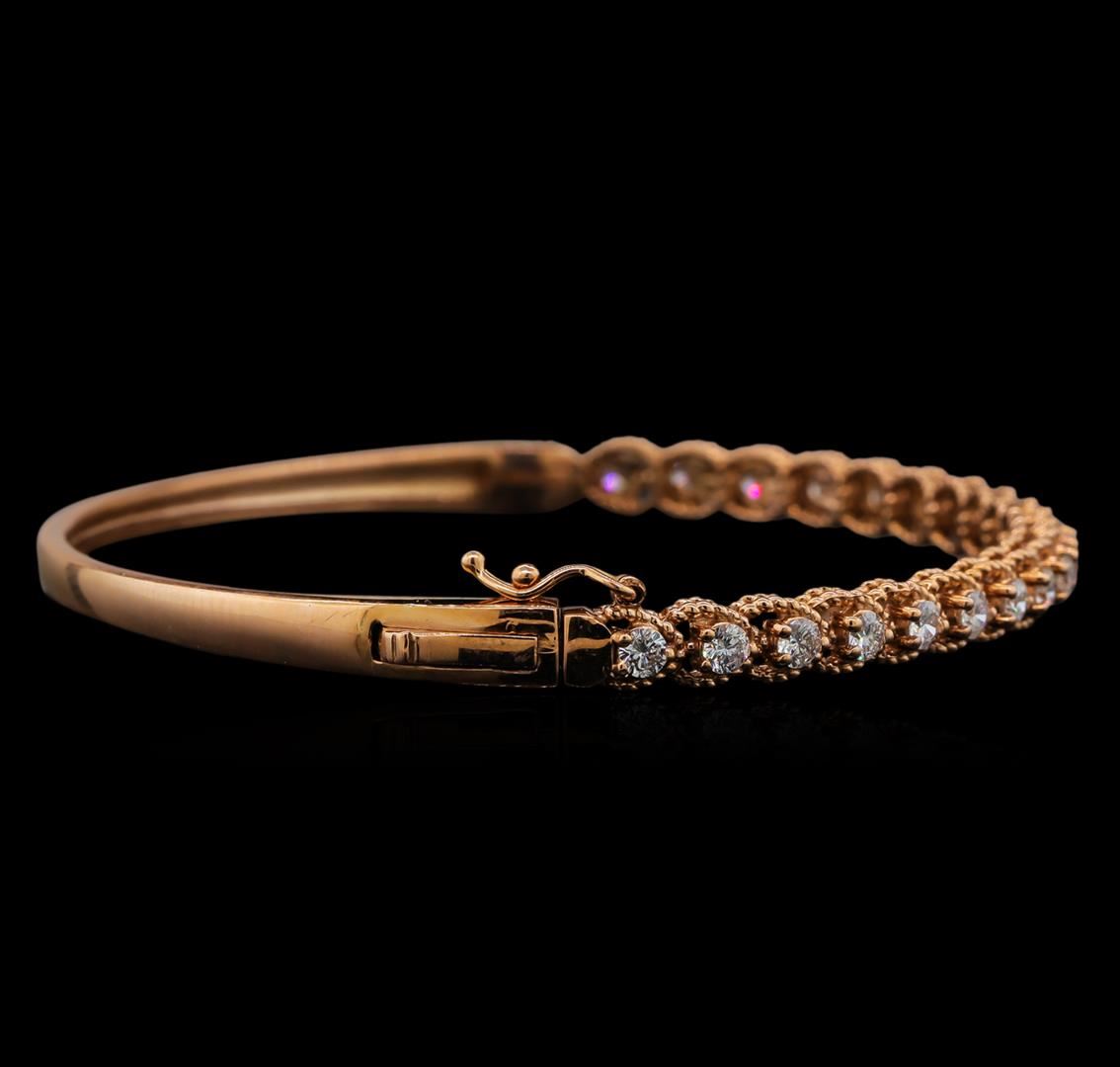 One electronically tested 14KT white gold ladies cast diamond bangle bracelet with a hidden box clasp with safety closer with a bright polish finish. Identified with markings of "14K". Condition is new. Containing: Twenty-One prong set round brilliant cut diamonds, measuring 2.50 - 2.50 x 1.50mm (depth est.) approximate total weight of 21 Stones = 1.33ct. Clarity: SI-1 to SI-2. Color: G - H, Cut is Good. All diamonds are graded in the mounting, unless otherwise stated. Total Weight of Diamonds 1.33ct. Total Weight of Bangle Bracelet 11.10 grams. GGL Appraised at $4,940.00.