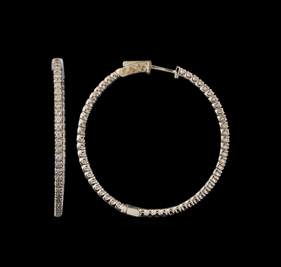 One pair electronically tested 14KT white gold ladies combination cast & assembled hoop earrings with hinged clip backs with a bright polish finish. Identified with markings of "14K". Condition is new. Containing: One Hundred Eight prong set round brilliant cut diamonds, measuring 1.50 - 1.50 x 0.90mm (depth est.) approximate total weight of 108 Stones = 1.33ct. Clarity: I-1 to I-2. Color: I - K, Cut is Good. All diamonds are graded in the mounting, unless otherwise stated. Total Weight of Diamonds 1.33ct. Total Weight of Earrings 9.40 grams. GGL Appraised at $3,935.00.