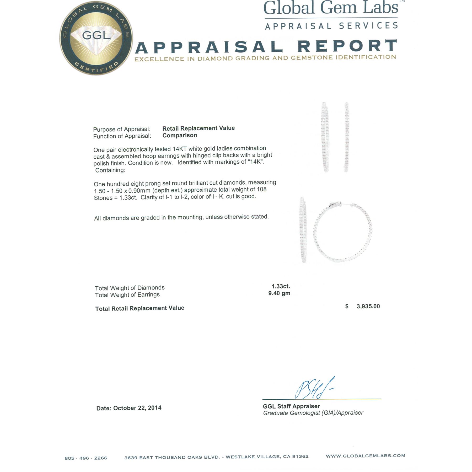 One pair electronically tested 14KT white gold ladies combination cast & assembled hoop earrings with hinged clip backs with a bright polish finish. Identified with markings of "14K". Condition is new. Containing: One Hundred Eight prong set round brilliant cut diamonds, measuring 1.50 - 1.50 x 0.90mm (depth est.) approximate total weight of 108 Stones = 1.33ct. Clarity: I-1 to I-2. Color: I - K, Cut is Good. All diamonds are graded in the mounting, unless otherwise stated. Total Weight of Diamonds 1.33ct. Total Weight of Earrings 9.40 grams. GGL Appraised at $3,935.00.