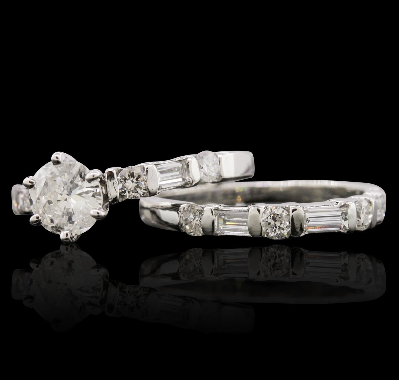 One electronically tested 14KT white gold Ladies combination cast & assembled engagement ring & wedding band with a bright polish finish. Condition is very good. Identified with markings of "14K". Containing: One prong set round brilliant cut diamond, measuring 5.90 - 5.90 x 3.54mm (depth est.) approximate weight of 0.75ct. Clarity: I-2. Color: J, Cut is Good. Eight prong set round brilliant cut diamonds, measuring 2.40 - 2.40 x 1.44mm (depth est.) approximate. Total Weight of 8 Stones = 0.41ct. Clarity: SI-2. Color: I, Cut is Good. Five prong set baguette cut diamonds, measuring 2.00 x 1.50 x 1.28mm (depth est.) approximate. Total Weight of 5 Stones = 0.18ct. Clarity: VS-2 to SI-1. Color: H - I, Cut is Good. All diamonds are graded in the mounting, unless otherwise stated. Total Weight of Diamonds 1.33ct. Total Weight of Engagement Ring & Wedding Band 4.40 grams.. GGL Appraised at $6,145.00.