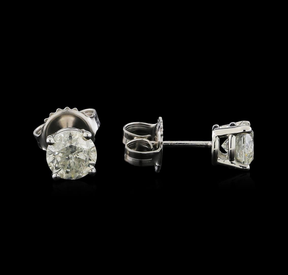 One pair electronically tested 14KT white gold ladies cast stud earrings with friction posts with a bright polish finish. Identified with markings of "14K". Condition is new. Containing: One prong set round brilliant cut diamond, measuring 5.64 - 5.61 x 3.37mm (depth est.) approximate weight of 0.65ct. Clarity: I-3. Color: I, Cut is Good. One prong set round brilliant cut diamond, measuring 5.71 - 5.70 x 3.43mm (depth est.) approximate weight of 0.68ct. Clarity: I-3. Color: I, Cut is Good. All diamonds are graded in the mounting, unless otherwise stated total weight of Diamonds 1.33ct. Total Weight of Earrings 1.60 grams. GGL Appraised at $4,515.00.
