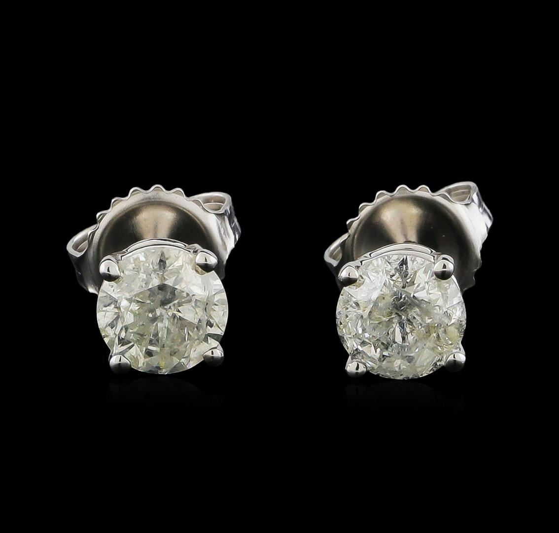 One pair electronically tested 14KT white gold ladies cast stud earrings with friction posts with a bright polish finish. Identified with markings of "14K". Condition is new. Containing: One prong set round brilliant cut diamond, measuring 5.64 - 5.61 x 3.37mm (depth est.) approximate weight of 0.65ct. Clarity: I-3. Color: I, Cut is Good. One prong set round brilliant cut diamond, measuring 5.71 - 5.70 x 3.43mm (depth est.) approximate weight of 0.68ct. Clarity: I-3. Color: I, Cut is Good. All diamonds are graded in the mounting, unless otherwise stated total weight of Diamonds 1.33ct. Total Weight of Earrings 1.60 grams. GGL Appraised at $4,515.00.