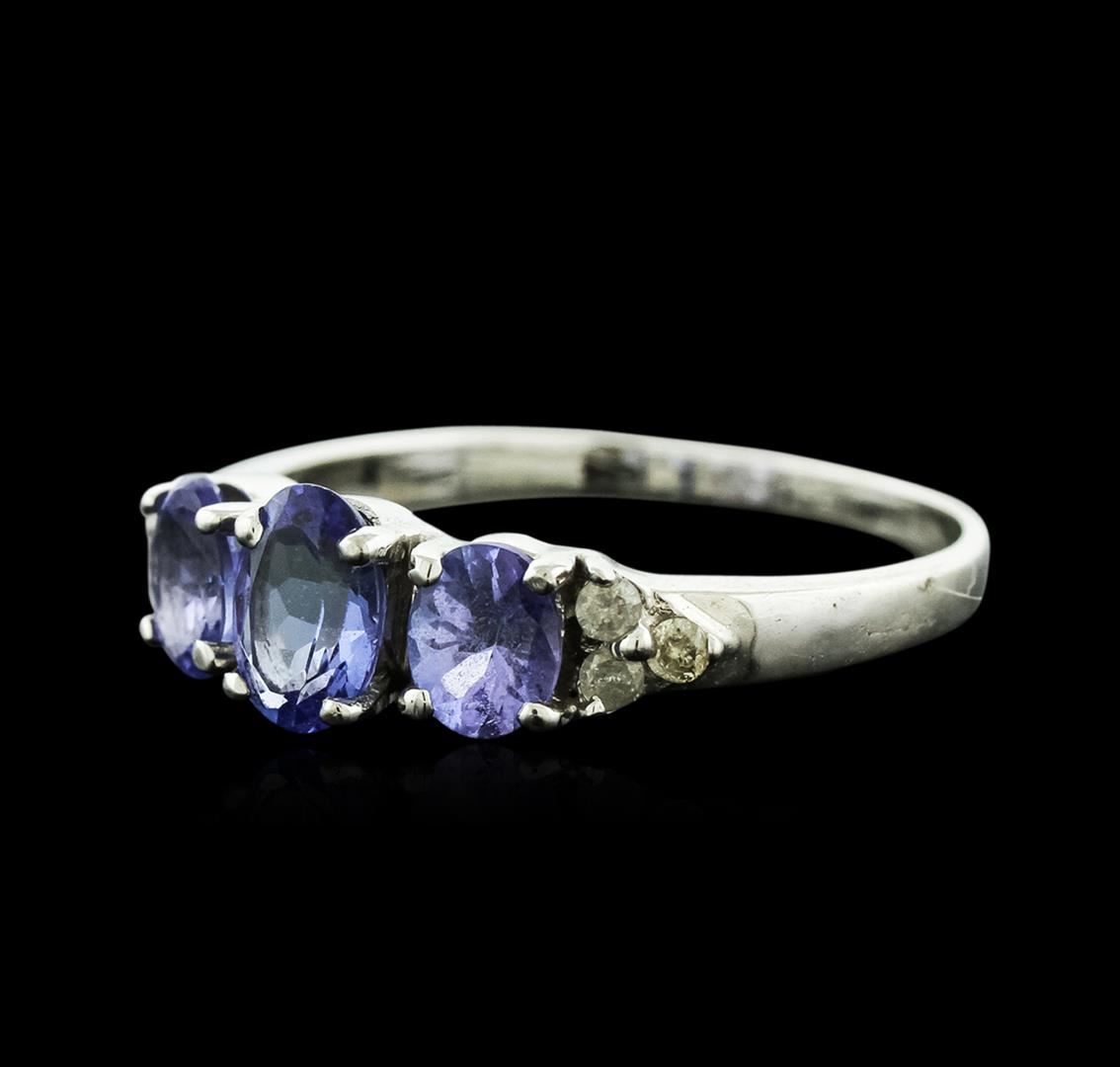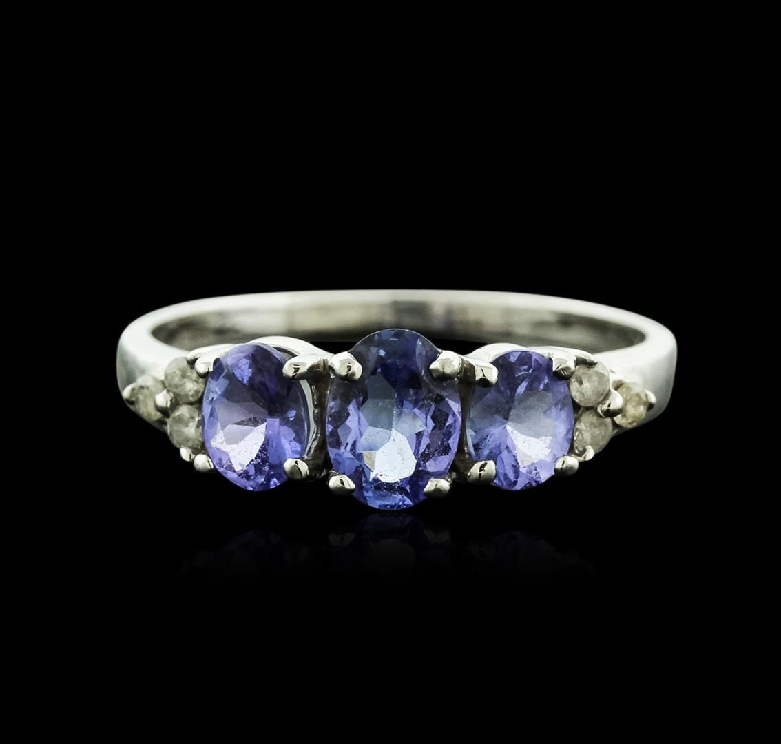 One electronically tested 14KT white gold ladies cast tanzanite and diamond ring with a bright polish finish. Identified with markings of "14K". Condition is new. Containing: One prong set oval modified brilliant cut natural tanzanite, measuring 6.40 x 4.50 x 2.93mm, approximate weight of 0.59ct., clarity is eye clean, type I, medium light, slightly grayish, violet color, (GIA V 4/2), cut is good. Two prong set oval modified brilliant cut natural tanzanites, measuring 5.00 x 4.00 x 2.60mm, approximate total weight of 0.74ct., clarity is eye clean, type I, medium light, slightly grayish, violet color, (GIA V 4/2), cut is good. Six prong set round brilliant cut diamonds, measuring 1.30 - 1.30 x 0.78mm (depth est.) approximate total weight of 6 Stones = 0.05ct. Clarity: I-1 to I-2. Color: I - J. Colored gemstones are presumed to have been subjected to commonly used enhancement processes. Colored gemstones are presumed to have been subjected to commonly used enhancement processes. All diamonds and colored gemstones are graded in the mounting, unless otherwise stated. All diamonds and colored gemstones are graded in the mounting, unless otherwise stated. Total Weight of Colored Stones 1.33ct. Total Weight of Diamonds 0.05ct. Total Weight of Ring 2.20 grams. GGL Appraised at $1,415.00.