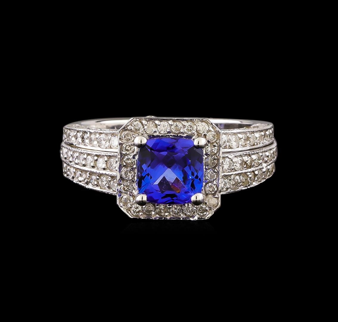 One electronically tested 14KT white gold ladies cast tanzanite and diamond ring. The featured tanzanite is set within a diamond bezel supported by a diamond set under gallery and diamond set shoulders, completed by a three and one-half millimeter wide band. Bright polish finish with milgrain detailing. Identified with markings of 14K. Condition is new, good workmanship. Containing: One prong set square cushion mixed cut natural tanzanite, measuring 6.45 x 6.50 x 3.80mm, 6% bulge factor, approximate weight of 1.33ct., clarity is eye clean, type I, medium dark, very slightly grayish, violetish blue color, (GIA vB 6/3), cut is good. Transmitting light with no distortion, transparent. Graded in the setting. Tanzanite is a very rare gemstone that is only found in the country of Tanzania. Originally discovered in 1967. Tiffany & Company, named the stone Tanzanite. It is found in the Usumburu Mountains that border the Umba Valley of northern Tanzania. Tanzanite occurs in gray, brown, violet, blue, reddish-purple, & green. The gem is interesting because of its exceptional pleochroism. Rotated in different directions a tanzanite will exhibit multiple changes of color. Tanzanite has a low tolerance to ultrasonic cleaning, and should not be cleaned using this method. One Hundred Thirty prong set round brilliant cut diamonds, measuring 1.50 - 1.20 x 0.81mm (depth est.) approximate total weight of 130 Stones = 1.27ct. Graded in the setting. Clarity: I-1 to I-3. Color: H - J. Total Weight of Colored Stones 1.33ct. Total Weight of Diamonds 1.27ct. Total Weight of Ring 5.91 grams. AIG Appraised at $6,700.00.