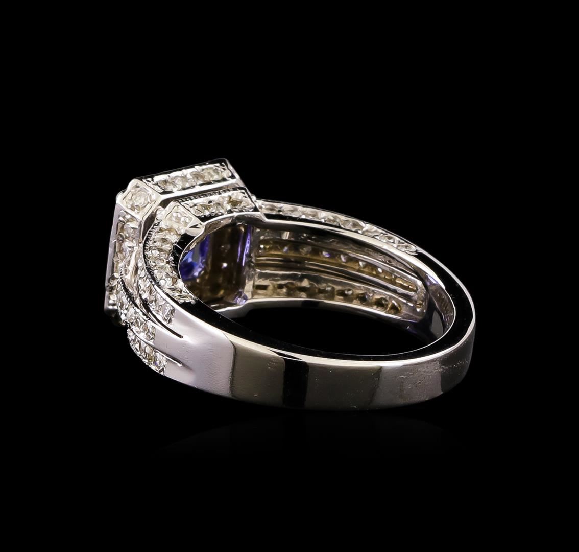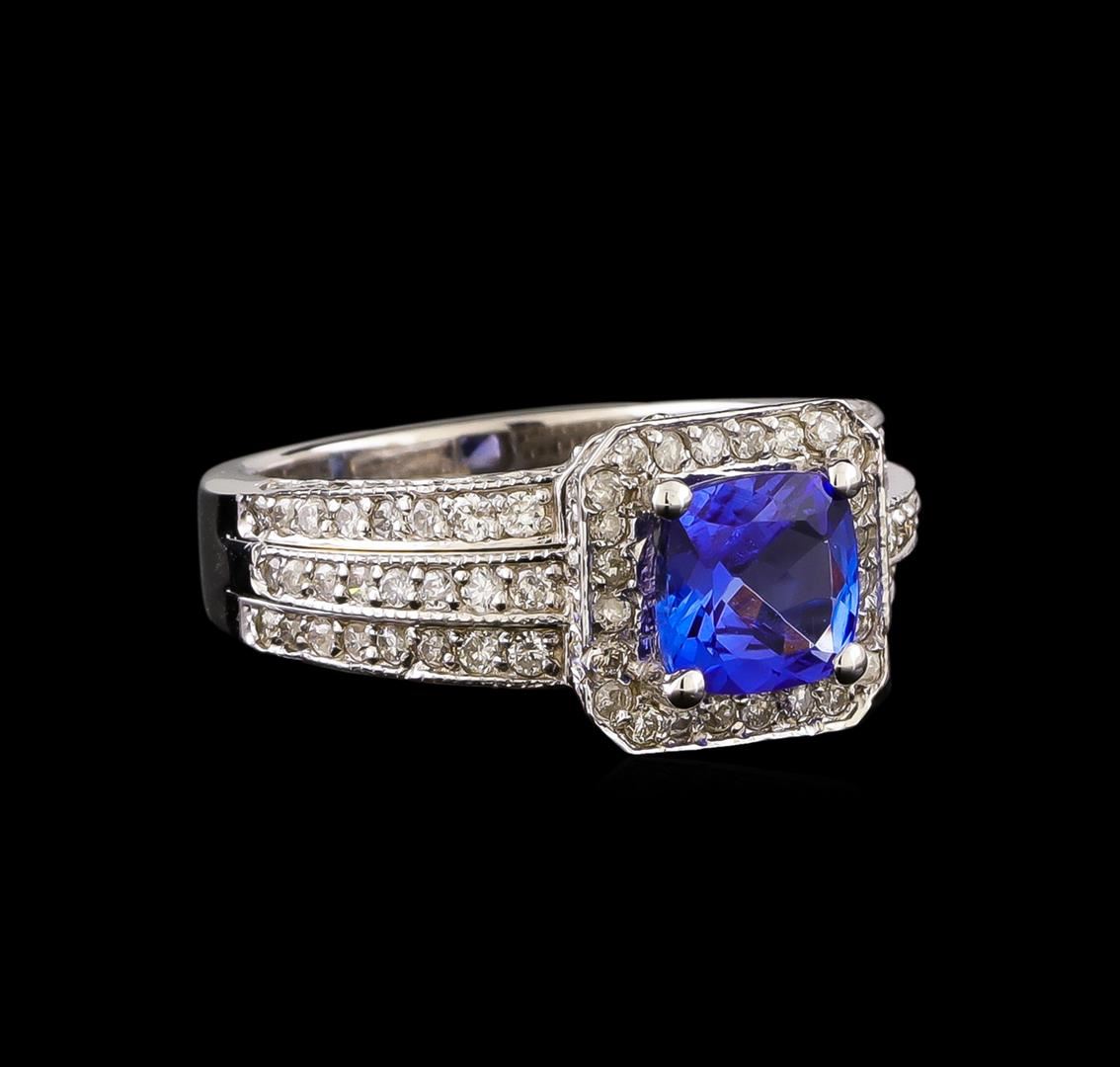 One electronically tested 14KT white gold ladies cast tanzanite and diamond ring. The featured tanzanite is set within a diamond bezel supported by a diamond set under gallery and diamond set shoulders, completed by a three and one-half millimeter wide band. Bright polish finish with milgrain detailing. Identified with markings of 14K. Condition is new, good workmanship. Containing: One prong set square cushion mixed cut natural tanzanite, measuring 6.45 x 6.50 x 3.80mm, 6% bulge factor, approximate weight of 1.33ct., clarity is eye clean, type I, medium dark, very slightly grayish, violetish blue color, (GIA vB 6/3), cut is good. Transmitting light with no distortion, transparent. Graded in the setting. Tanzanite is a very rare gemstone that is only found in the country of Tanzania. Originally discovered in 1967. Tiffany & Company, named the stone Tanzanite. It is found in the Usumburu Mountains that border the Umba Valley of northern Tanzania. Tanzanite occurs in gray, brown, violet, blue, reddish-purple, & green. The gem is interesting because of its exceptional pleochroism. Rotated in different directions a tanzanite will exhibit multiple changes of color. Tanzanite has a low tolerance to ultrasonic cleaning, and should not be cleaned using this method. One Hundred Thirty prong set round brilliant cut diamonds, measuring 1.50 - 1.20 x 0.81mm (depth est.) approximate total weight of 130 Stones = 1.27ct. Graded in the setting. Clarity: I-1 to I-3. Color: H - J. Total Weight of Colored Stones 1.33ct. Total Weight of Diamonds 1.27ct. Total Weight of Ring 5.91 grams. AIG Appraised at $6,700.00.