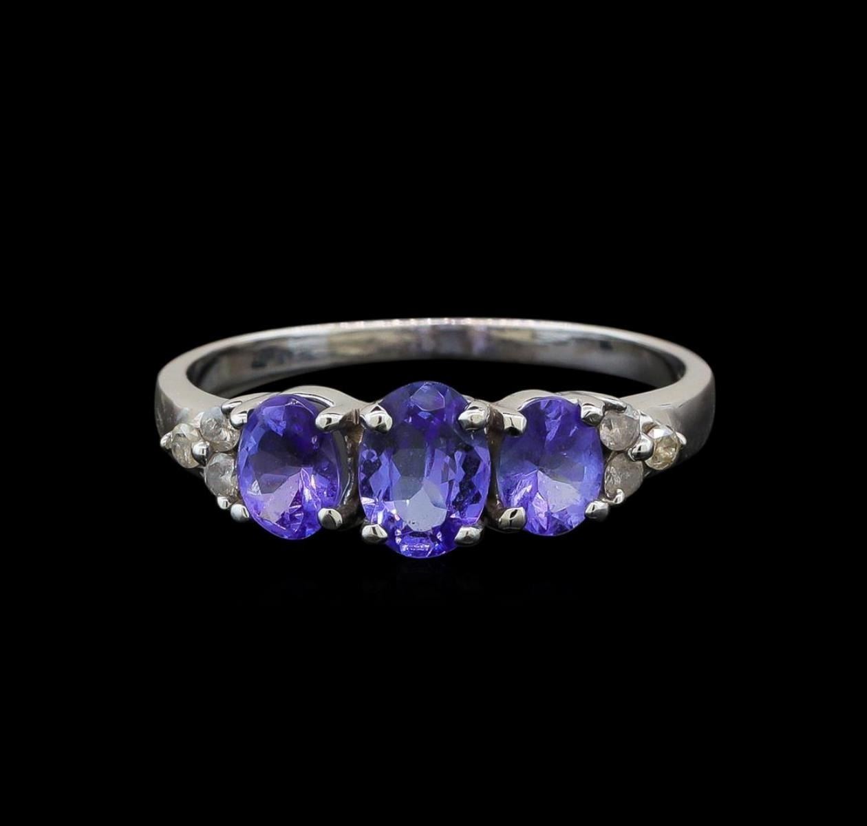 One electronically tested 14KT white gold ladies cast tanzanite and diamond ring with a bright polish finish. Identified with markings of "14K". Condition is new. Containing: One prong set oval modified brilliant cut natural tanzanite, measuring 6.40 x 4.50 x 2.93mm, approximate weight of 0.59ct., clarity is eye clean, type I, medium light, slightly grayish, violet color, (GIA V 4/2), cut is good. Two prong set oval modified brilliant cut natural tanzanites, measuring 5.00 x 4.00 x 2.60mm, approximate total weight of 0.74ct., clarity is eye clean, type I, medium light, slightly grayish, violet color, (GIA V 4/2), cut is good. Six prong set round brilliant cut diamonds, measuring 1.30 - 1.30 x 0.78mm (depth est.) approximate total weight of 6 Stones = 0.05ct. Clarity: I-1 to I-2. Color: I - J. Colored gemstones are presumed to have been subjected to commonly used enhancement processes. Colored gemstones are presumed to have been subjected to commonly used enhancement processes. All diamonds and colored gemstones are graded in the mounting, unless otherwise stated. All diamonds and colored gemstones are graded in the mounting, unless otherwise stated. Total Weight of Colored Stones 1.33ct. Total Weight of Diamonds 0.05ct. Total Weight of Ring 2.20 grams. GGL Appraised.