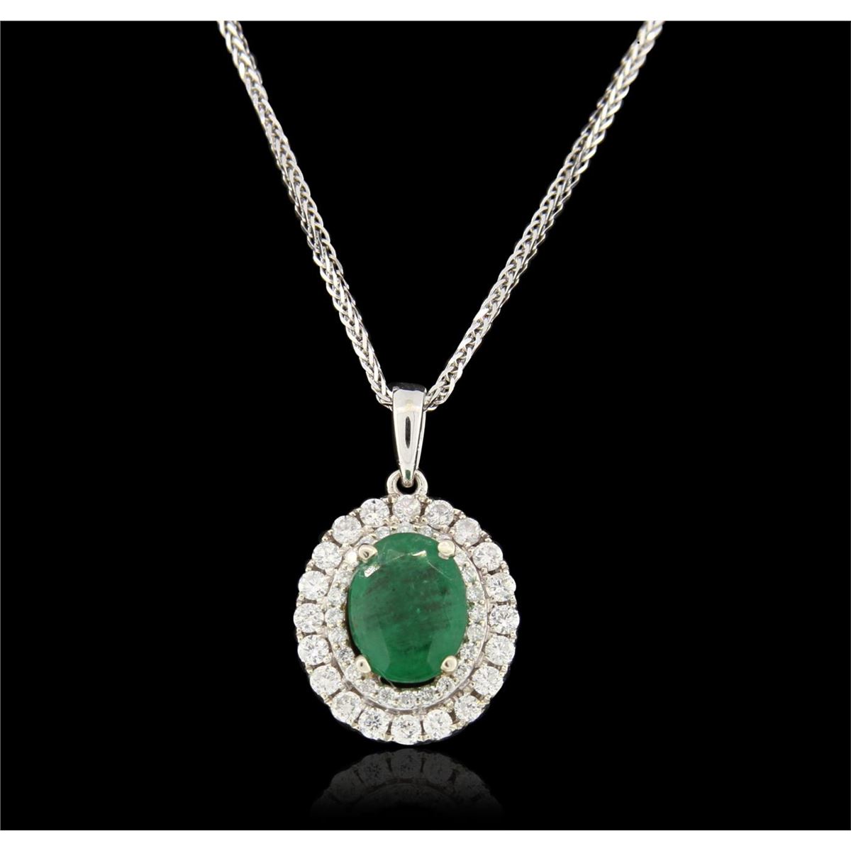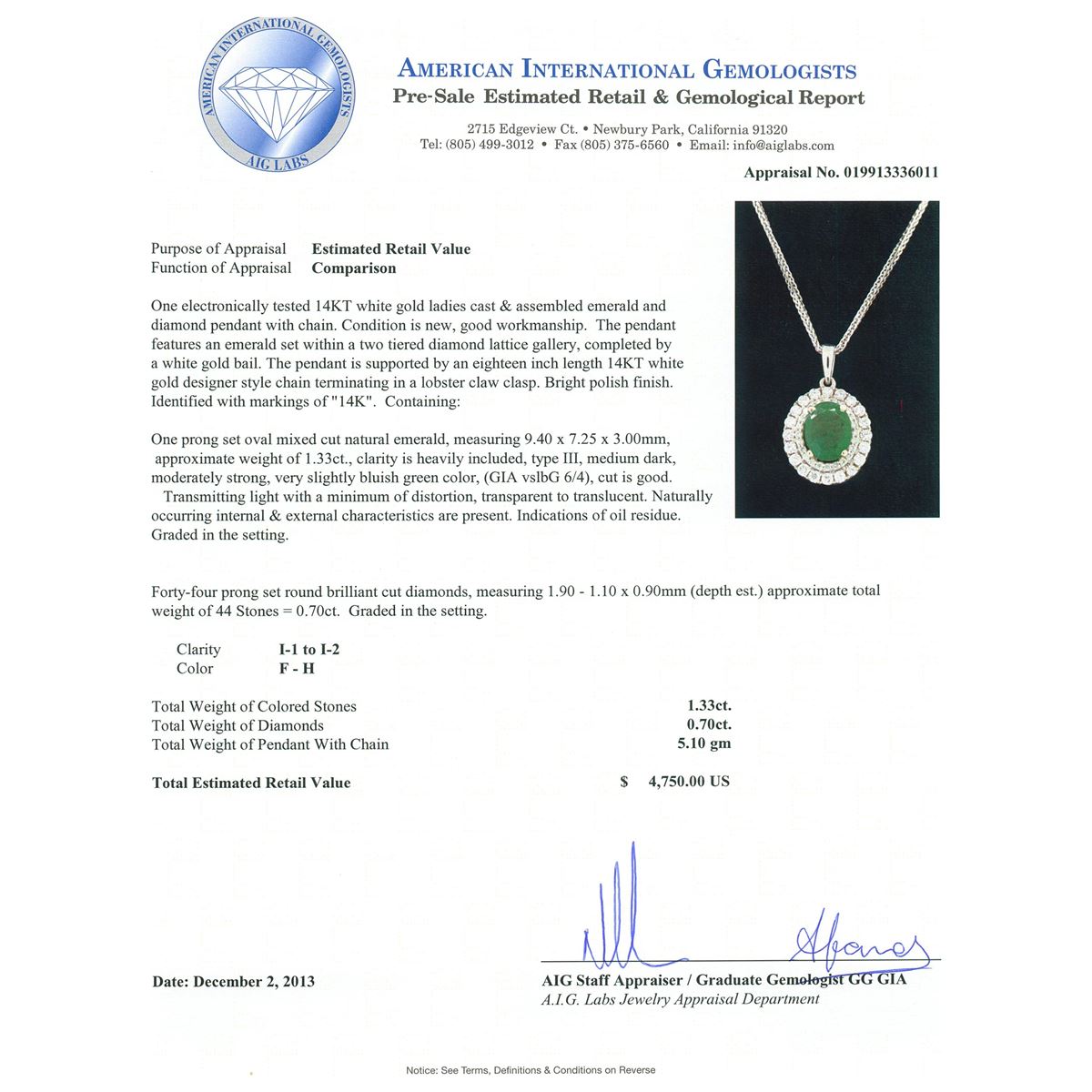 One electronically tested 14KT white gold ladies cast & assembled emerald and diamond pendant with chain. Condition is new, good workmanship. The pendant features an emerald set within a two tiered diamond lattice gallery, completed by a white gold bail. The pendant is supported by an eighteen inch length 14KT white gold designer style chain terminating in a lobster claw clasp. Bright polish finish. Identified with markings of "14K". Containing: One prong set oval mixed cut natural emerald, measuring 9.40 x 7.25 x 3.00mm, approximate weight of 1.33ct., clarity is heavily included, type III, medium dark, moderately strong, very slightly bluish green color, (GIA vslbG 6/4), cut is good. Transmitting light with a minimum of distortion, transparent to translucent. Naturally occurring internal & external characteristics are present. Indications of oil residue. Graded in the setting. Forty-four prong set round brilliant cut diamonds, measuring 1.90 - 1.10 x 0.90mm (depth est.) approximate total weight of 44 Stones = 0.70ct. Graded in the setting. Clarity I-1 to 1-2. Color F -- H. Total Weight of Colored Stones 1.33ct. Total Weight of Diamonds 0.70ct. Total Weight of Pendant With Chain 5.10gm. AIG Appraised at $4,750.00.