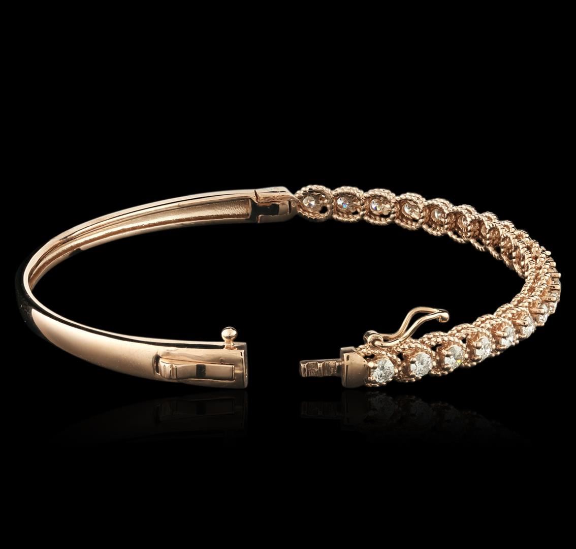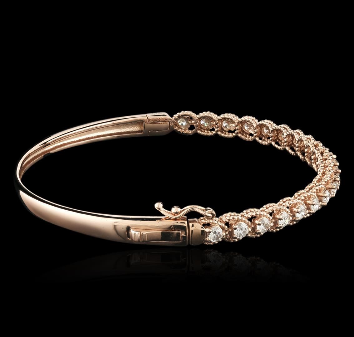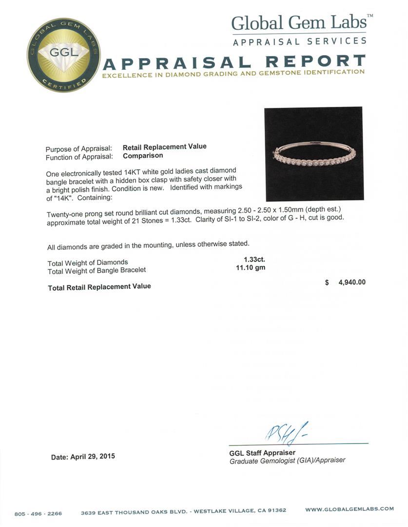 One electronically tested 14KT white gold ladies cast diamond bangle bracelet with a hidden box clasp with safety closer with a bright polish finish. Identified with markings of "14K". Condition is new. Containing: Twenty-One prong set round brilliant cut diamonds, measuring 2.50 - 2.50 x 1.50mm (depth est.) approximate total weight of 21 Stones = 1.33ct. Clarity: SI-1 to SI-2. Color: G - H, Cut is Good. All diamonds are graded in the mounting, unless otherwise stated. Total Weight of Diamonds 1.33ct. Total Weight of Bangle Bracelet 11.10 grams. GGL Appraised at $4,940.00.