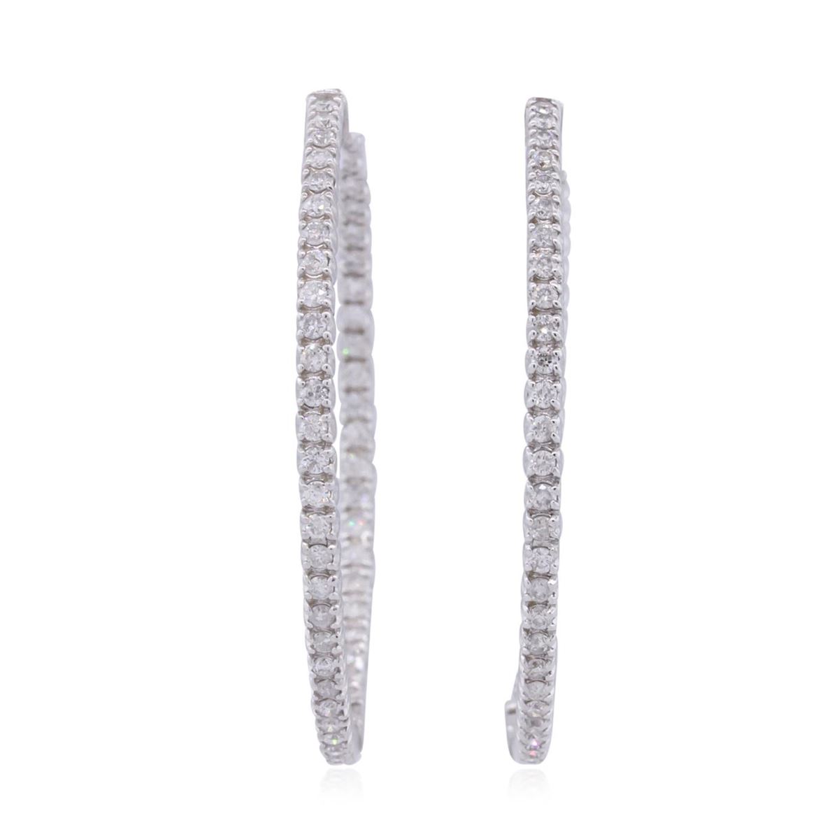One pair electronically tested 14KT white gold ladies combination cast & assembled hoop earrings with hinged clip backs with a bright polish finish. Identified with markings of "14K". Condition is new. Containing: One Hundred Eight prong set round brilliant cut diamonds, measuring 1.50 - 1.50 x 0.90mm (depth est.) approximate total weight of 108 Stones = 1.33ct. Clarity: I-1 to I-2. Color: I - K, Cut is Good. All diamonds are graded in the mounting, unless otherwise stated. Total Weight of Diamonds 1.33ct. Total Weight of Earrings 9.40 grams. GGL Appraised at $3,935.00.