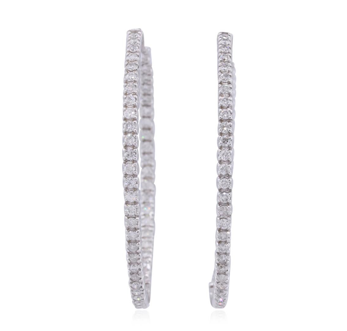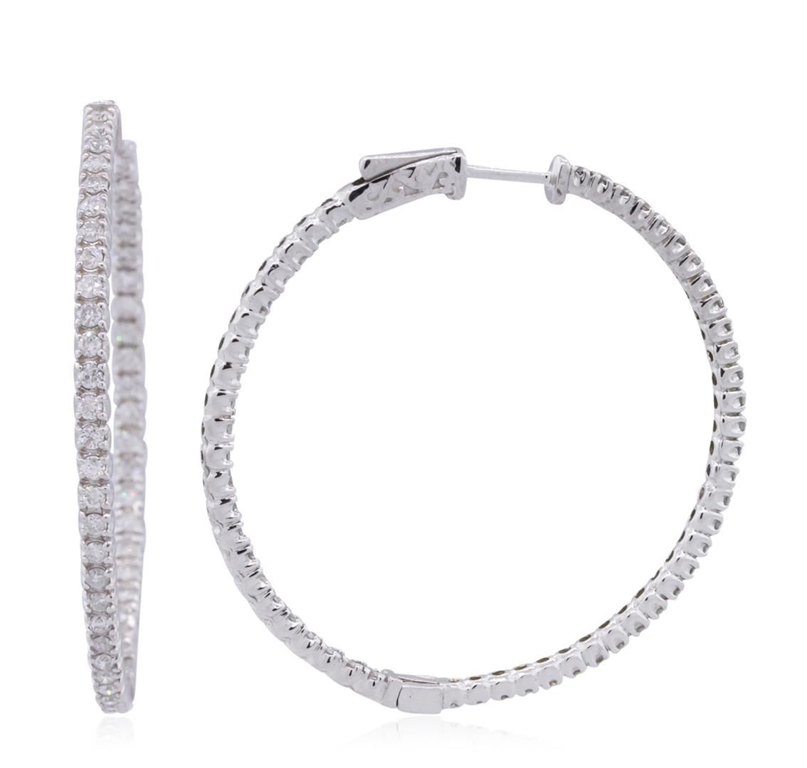 One pair electronically tested 14KT white gold ladies combination cast & assembled hoop earrings with hinged clip backs with a bright polish finish. Identified with markings of "14K". Condition is new. Containing: One Hundred Eight prong set round brilliant cut diamonds, measuring 1.50 - 1.50 x 0.90mm (depth est.) approximate total weight of 108 Stones = 1.33ct. Clarity: I-1 to I-2. Color: I - K, Cut is Good. All diamonds are graded in the mounting, unless otherwise stated. Total Weight of Diamonds 1.33ct. Total Weight of Earrings 9.40 grams. GGL Appraised at $3,935.00.