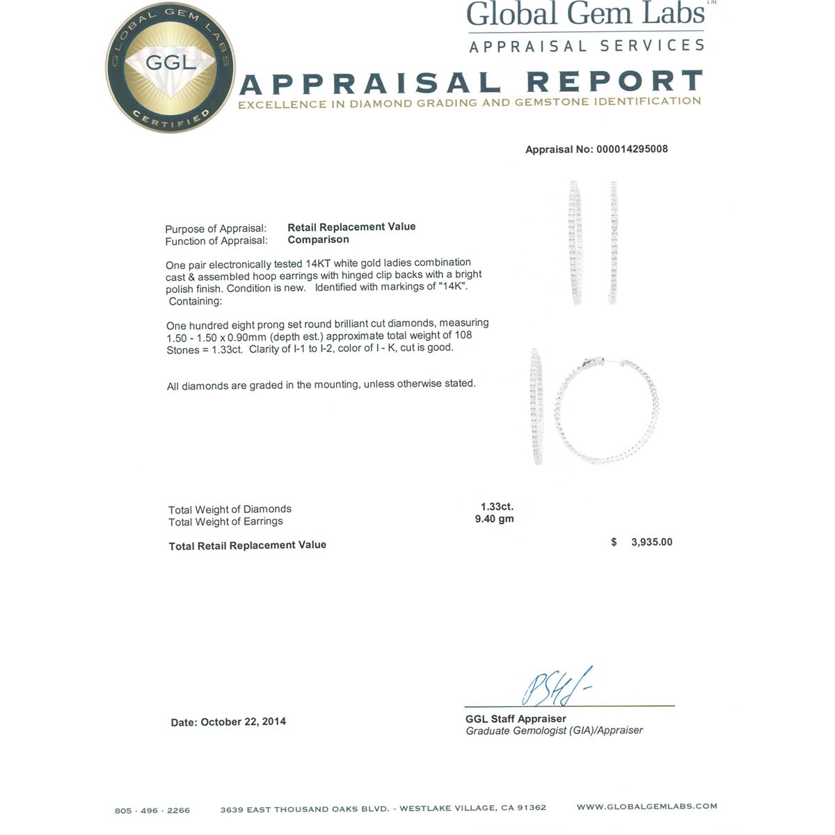One pair electronically tested 14KT white gold ladies combination cast & assembled hoop earrings with hinged clip backs with a bright polish finish. Identified with markings of "14K". Condition is new. Containing: One Hundred Eight prong set round brilliant cut diamonds, measuring 1.50 - 1.50 x 0.90mm (depth est.) approximate total weight of 108 Stones = 1.33ct. Clarity: I-1 to I-2. Color: I - K, Cut is Good. All diamonds are graded in the mounting, unless otherwise stated. Total Weight of Diamonds 1.33ct. Total Weight of Earrings 9.40 grams. GGL Appraised at $3,935.00.