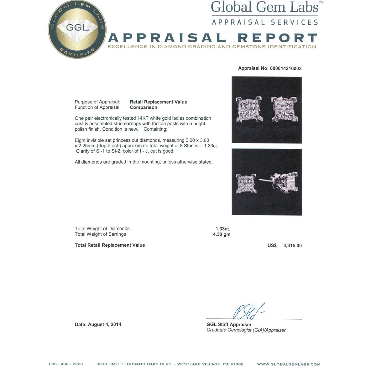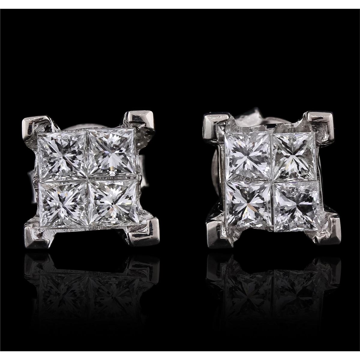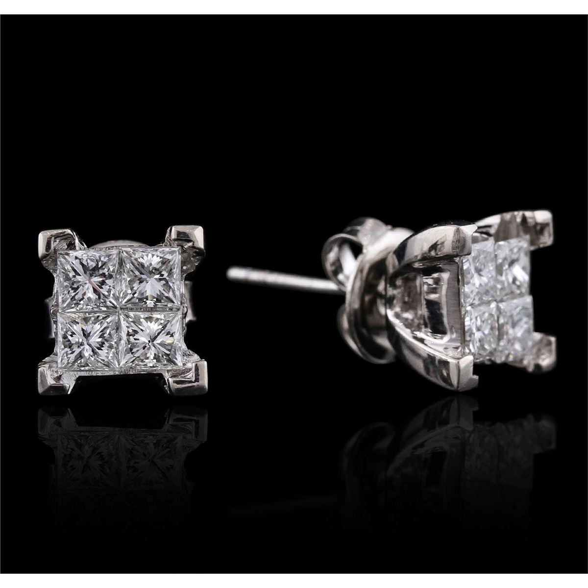 One pair electronically tested 14KT white gold ladies combination cast & assembled stud earrings with friction posts with a bright polish finish. Condition is new. Containing: Eight invisible set princess cut diamonds, measuring 3.00 x 3.00 x 2.25mm (depth est.) approximate. Total Weight of 8 Stones = 1.33ct. Clarity: SI-1 to SI-2. Color: I - J, Cut is Good. All diamonds are graded in the mounting, unless otherwise stated. Total Weight of Diamonds 1.33ct. Total Weight of Earrings 4.30 grams. GGL Appraised at $4,315.00.