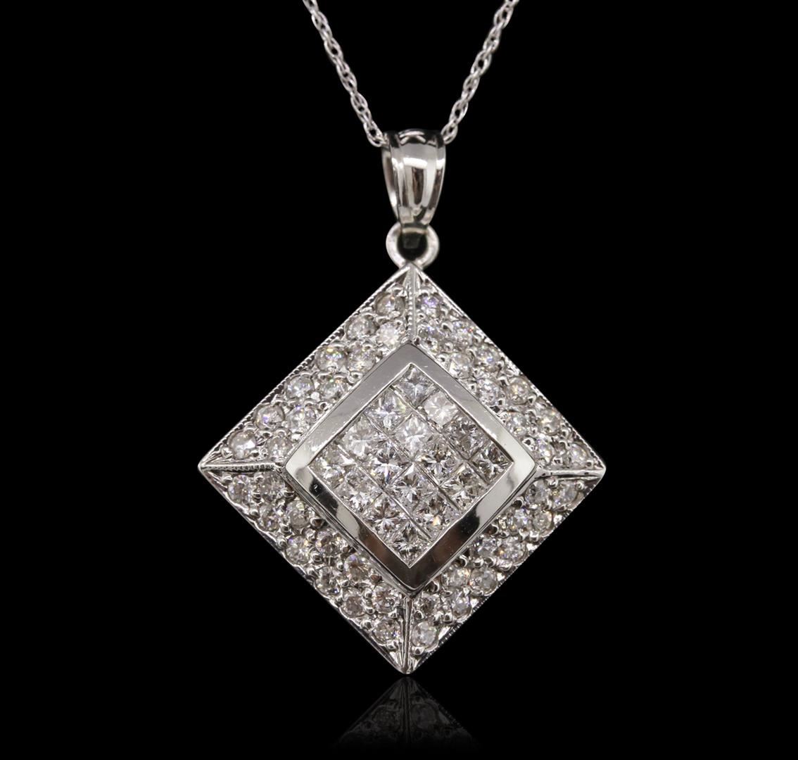 One electronically tested 14KT white gold Ladies combination cast & assembled pendant & chain 15.0" long, light cable link with a spring ring clasp with a bright polish finish. Condition is new. Identified with markings of "14K". Containing: Sixteen invisible set princess cut diamonds, measuring 2.00 x 2.00 x 1.50mm (depth est.) approximate. Total Weight of 16 Stones = 0.79ct. Clarity: SI-1 to SI-2. Color: J, Cut is Good. Forty-Four bead set round brilliant cut diamonds, measuring 1.50 - 1.50 x 0.90mm (depth est.) approximate. Total Weight of 44 Stones = 0.54ct. Clarity: SI-2 to I-1. Color: J, Cut is Good. Total Weight of Diamonds 1.33ct. Total Weight of Pendant & Chain 6.20 grams. GGL Appraised at $4,960.00.