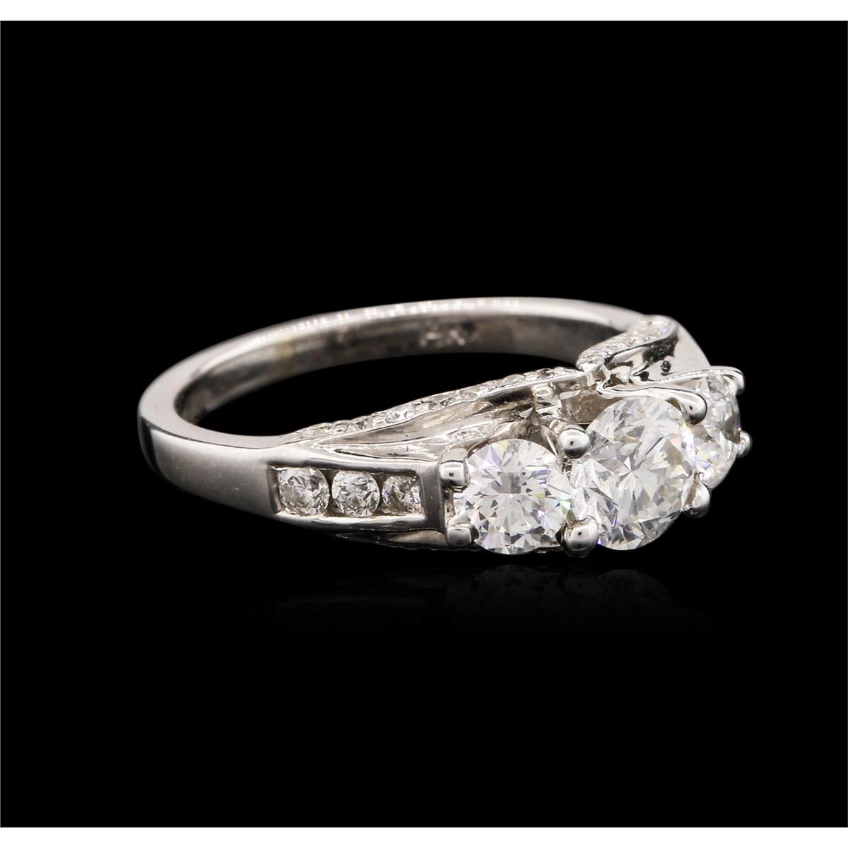 One electronically tested 14KT white gold ladies cast diamond engagement ring with a bright polish finish. Identified with markings of "14K". Condition is new. Containing: One prong set round brilliant cut diamond, measuring 5.40 - 5.40 x 3.24mm (depth est.) approximate weight of 0.58ct. Clarity: SI-1. Color: I, Cut is Good. Two prong set round brilliant cut diamonds, measuring 3.90 - 3.90 x 2.34mm (depth est.) approximate total weight of 2 Stones = 0.43ct. Clarity: VS-2. Color: I - J, Cut is Good. Thirty-Two prong set round brilliant cut diamonds, measuring 1.50 - 1.30 x 0.84mm (depth est.) approximate total weight of 32 Stones = 0.32ct. Clarity: SI-2 to I-1. Color: I - J, Cut is Good. All diamonds are graded in the mounting, unless otherwise stated. Total Weight of Diamonds 1.33ct. Total Weight of Ring 4.10 grams. GGL Appraised at $6,470.00.