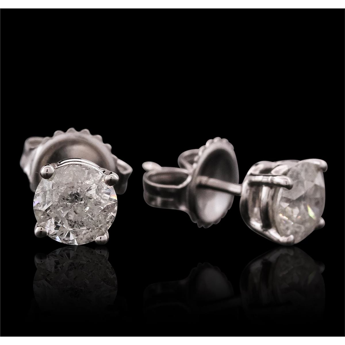 One pair electronically tested 14KT white gold ladies cast stud earrings with friction posts with a bright polish finish. Identified with markings of "14K". Condition is new. Containing: One prong set round brilliant cut diamond, measuring 5.64 - 5.61 x 3.37mm (depth est.) approximate weight of 0.65ct. Clarity: I-3. Color: I, Cut is Good. One prong set round brilliant cut diamond, measuring 5.71 - 5.70 x 3.43mm (depth est.) approximate weight of 0.68ct. Clarity: I-3. Color: I, Cut is Good. All diamonds are graded in the mounting, unless otherwise stated total weight of Diamonds 1.33ct. Total Weight of Earrings 1.60 grams. GGL Appraised at $4,515.00.