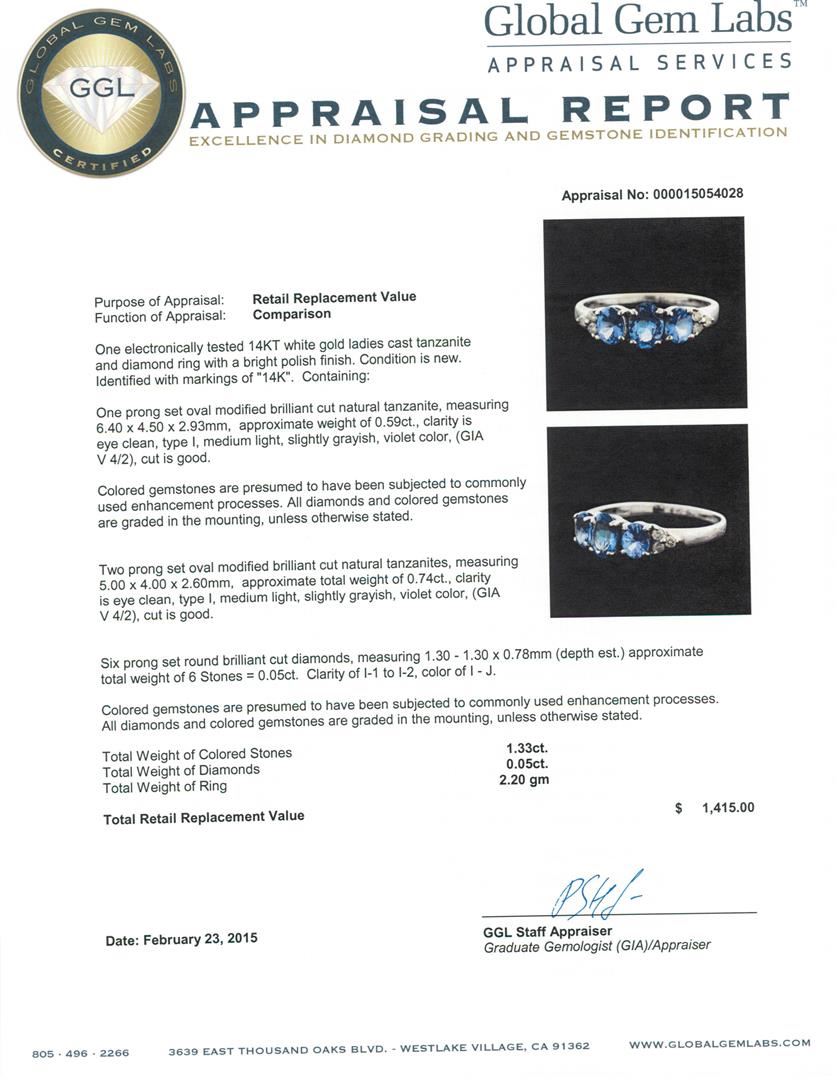 One electronically tested 14KT white gold ladies cast tanzanite and diamond ring with a bright polish finish. Identified with markings of "14K". Condition is new. Containing: One prong set oval modified brilliant cut natural tanzanite, measuring 6.40 x 4.50 x 2.93mm, approximate weight of 0.59ct., clarity is eye clean, type I, medium light, slightly grayish, violet color, (GIA V 4/2), cut is good. Two prong set oval modified brilliant cut natural tanzanites, measuring 5.00 x 4.00 x 2.60mm, approximate total weight of 0.74ct., clarity is eye clean, type I, medium light, slightly grayish, violet color, (GIA V 4/2), cut is good. Six prong set round brilliant cut diamonds, measuring 1.30 - 1.30 x 0.78mm (depth est.) approximate total weight of 6 Stones = 0.05ct. Clarity: I-1 to I-2. Color: I - J. Colored gemstones are presumed to have been subjected to commonly used enhancement processes. Colored gemstones are presumed to have been subjected to commonly used enhancement processes. All diamonds and colored gemstones are graded in the mounting, unless otherwise stated. All diamonds and colored gemstones are graded in the mounting, unless otherwise stated. Total Weight of Colored Stones 1.33ct. Total Weight of Diamonds 0.05ct. Total Weight of Ring 2.20 grams. GGL Appraised at $1,415.00.