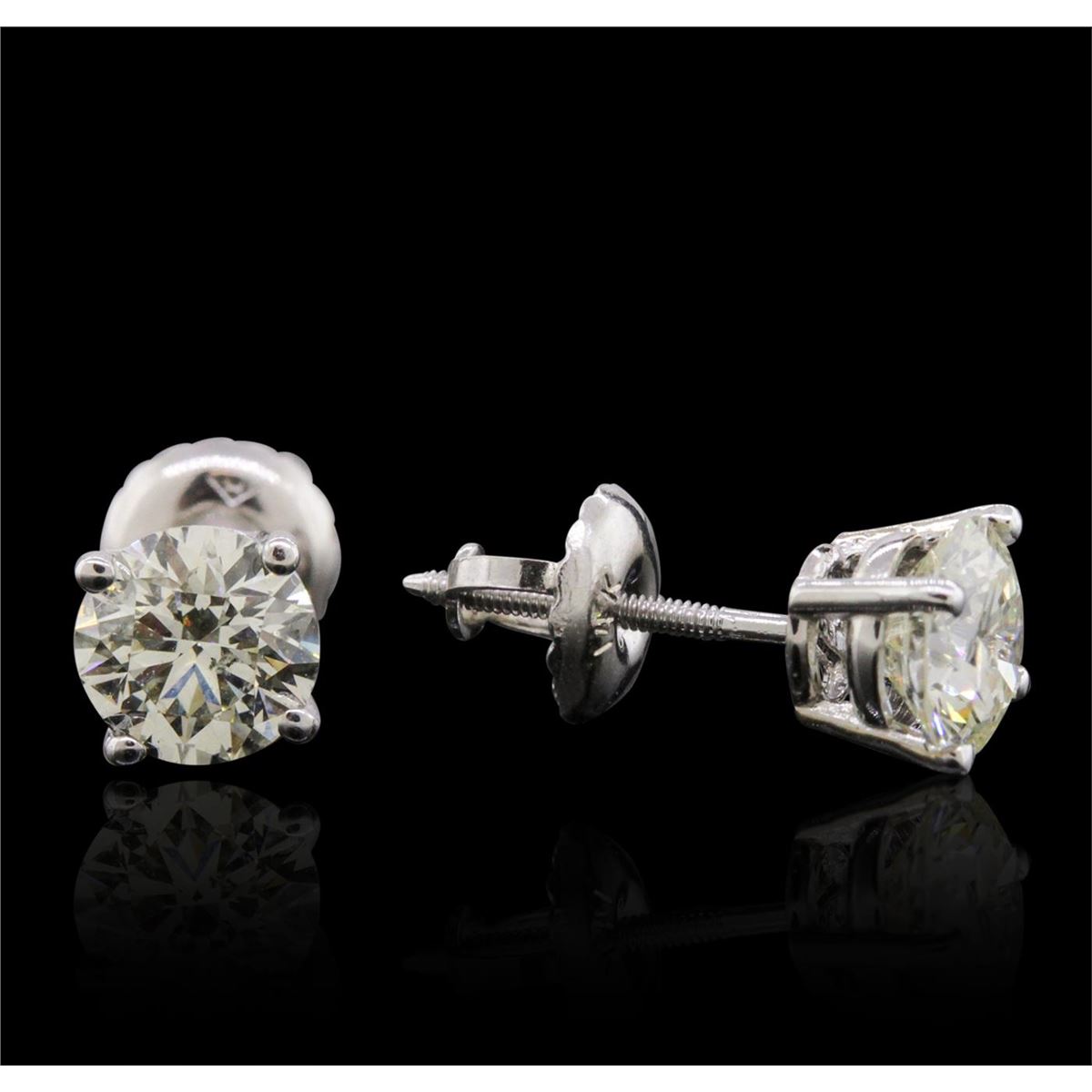One pair electronically tested 14KT white gold cast & assembled diamond solitaire earrings with screw backs. Bright polish finish. Condition is new, good workmanship. Containing: One prong set round brilliant cut diamond, measuring 5.38 - 5.37 x 3.23mm (depth est.) approximate weight of 0.67ct with a faint blue fluorescence. Graded in the setting. Clarity: I-1. Depth: 60.0%. Table 63.2%. One prong set round brilliant cut diamond, measuring 5.30 - 5.29 x 3.35mm (depth est.) approximate weight of 0.67ct with a strong blue fluorescence. Graded in the setting. Clarity: SI-2. Depth: 63.2%. Table 57.6%. Total Weight of Diamonds 1.34ct. Total Weight of Earrings 0.98 grams. AIG Appraised at $4,455.00.
