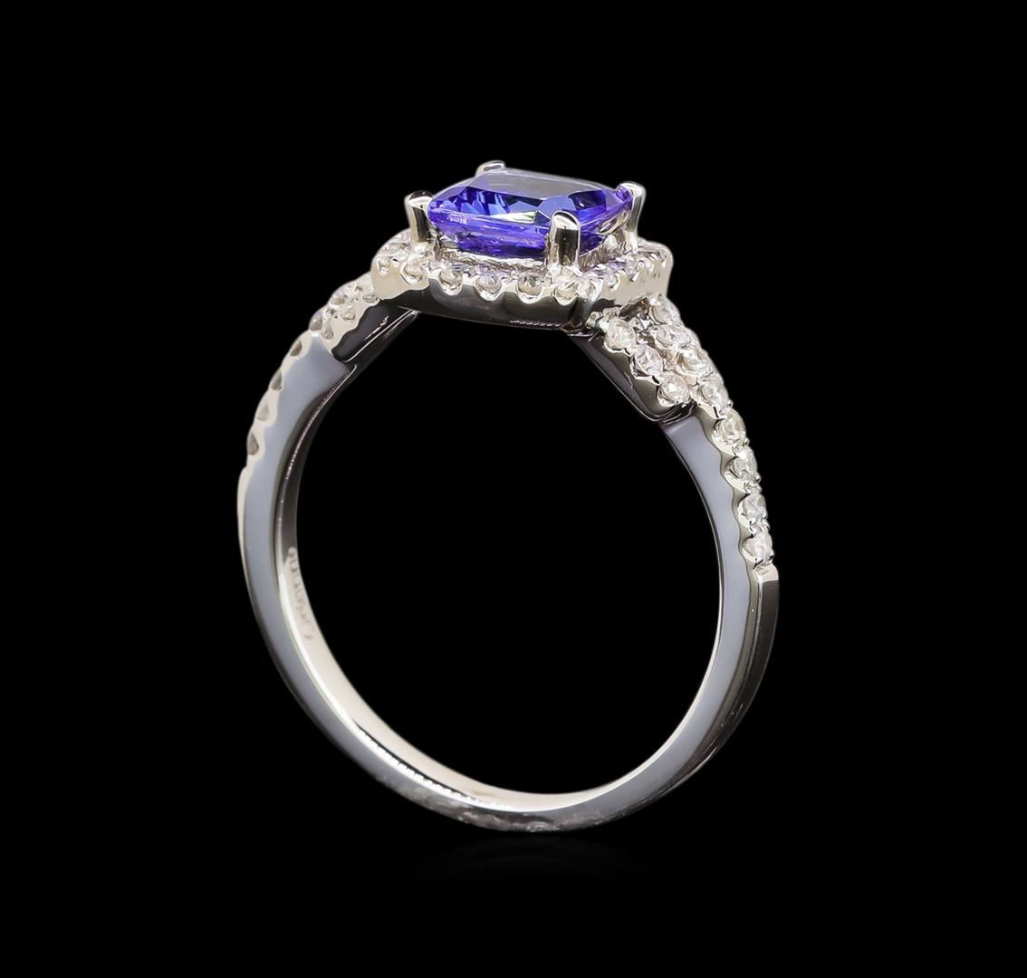 One electronically tested 14KT white gold ladies cast tanzanite and diamond ring with a flat shank with a bright polish finish. Trademark is Orianne. Identified with markings of "14K". Condition is new. Containing: One prong set square cushion modified brilliant cut natural tanzanite, measuring 6.40 x 6.40 x 4.16mm, approximate weight of 1.34ct., clarity is eye clean, type I, medium light, very slightly grayish, violet color, (GIA V 4/3), cut is good. Forty-Six channel set round brilliant cut diamonds, measuring 1.20 - 1.20 x 0.72mm (depth est.) approximate total weight of 46 Stones = 0.29ct. Clarity: I-1 to I-2. Color: I - J. All diamonds and colored gemstones are graded in the mounting, unless otherwise stated. Colored gemstones are presumed to have been subjected to commonly used enhancement processes.. Total Weight of Colored Stones 1.34ct. Total Weight of Diamonds 0.29ct. Total Weight of Ring 3.20 grams. GGL Appraised at $2,240.00.
