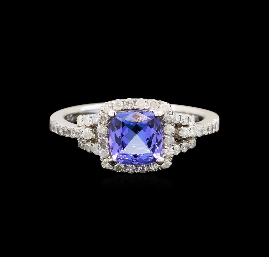 One electronically tested 14KT white gold ladies cast tanzanite and diamond ring with a flat shank with a bright polish finish. Trademark is Orianne. Identified with markings of "14K". Condition is new. Containing: One prong set square cushion modified brilliant cut natural tanzanite, measuring 6.40 x 6.40 x 4.16mm, approximate weight of 1.34ct., clarity is eye clean, type I, medium light, very slightly grayish, violet color, (GIA V 4/3), cut is good. Forty-Six channel set round brilliant cut diamonds, measuring 1.20 - 1.20 x 0.72mm (depth est.) approximate total weight of 46 Stones = 0.29ct. Clarity: I-1 to I-2. Color: I - J. All diamonds and colored gemstones are graded in the mounting, unless otherwise stated. Colored gemstones are presumed to have been subjected to commonly used enhancement processes.. Total Weight of Colored Stones 1.34ct. Total Weight of Diamonds 0.29ct. Total Weight of Ring 3.20 grams. GGL Appraised at $2,240.00.