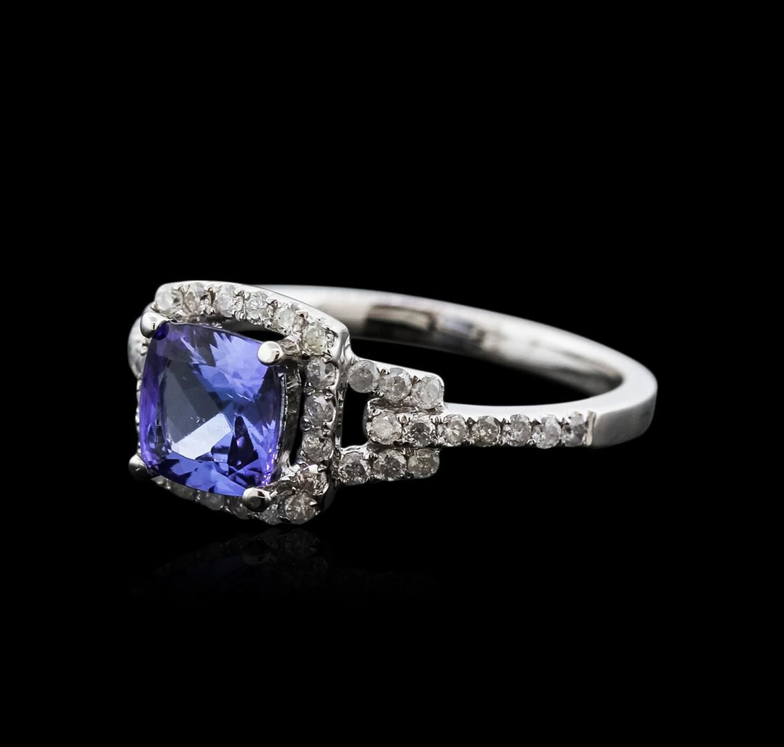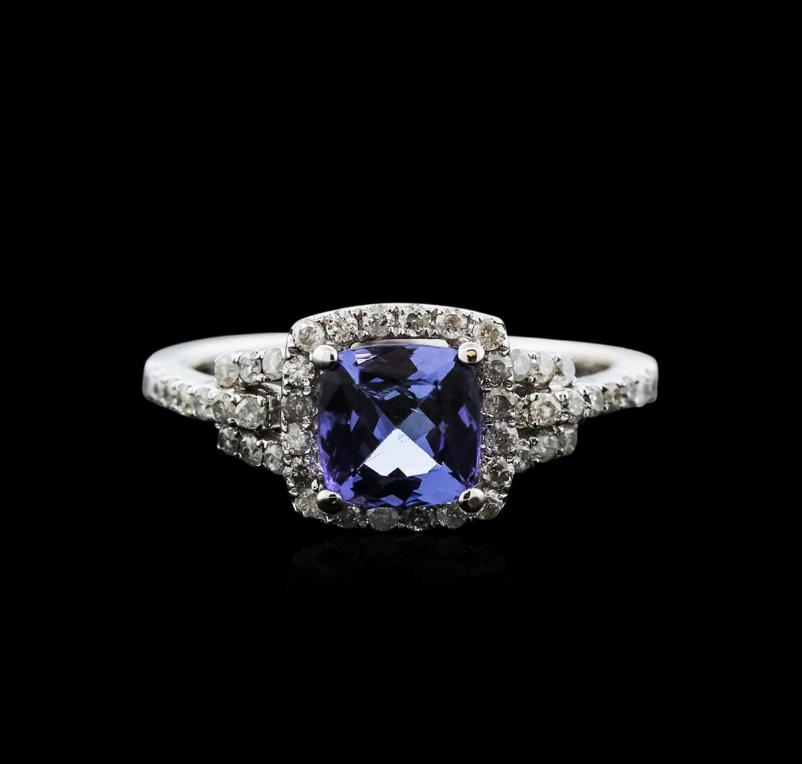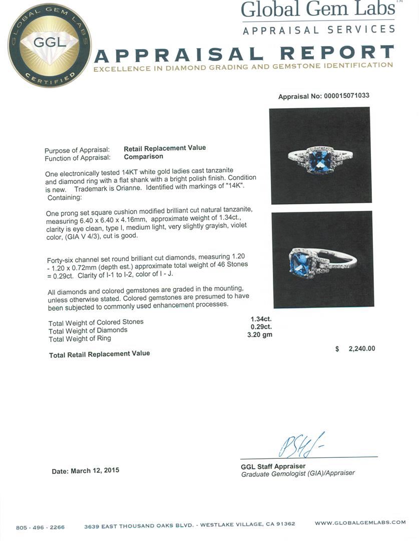 One electronically tested 14KT white gold ladies cast tanzanite and diamond ring with a flat shank with a bright polish finish. Trademark is Orianne. Identified with markings of "14K". Condition is new. Containing: One prong set square cushion modified brilliant cut natural tanzanite, measuring 6.40 x 6.40 x 4.16mm, approximate weight of 1.34ct., clarity is eye clean, type I, medium light, very slightly grayish, violet color, (GIA V 4/3), cut is good. Forty-Six channel set round brilliant cut diamonds, measuring 1.20 - 1.20 x 0.72mm (depth est.) approximate total weight of 46 Stones = 0.29ct. Clarity: I-1 to I-2. Color: I - J. All diamonds and colored gemstones are graded in the mounting, unless otherwise stated. Colored gemstones are presumed to have been subjected to commonly used enhancement processes.. Total Weight of Colored Stones 1.34ct. Total Weight of Diamonds 0.29ct. Total Weight of Ring 3.20 grams. GGL Appraised at $2,240.00.