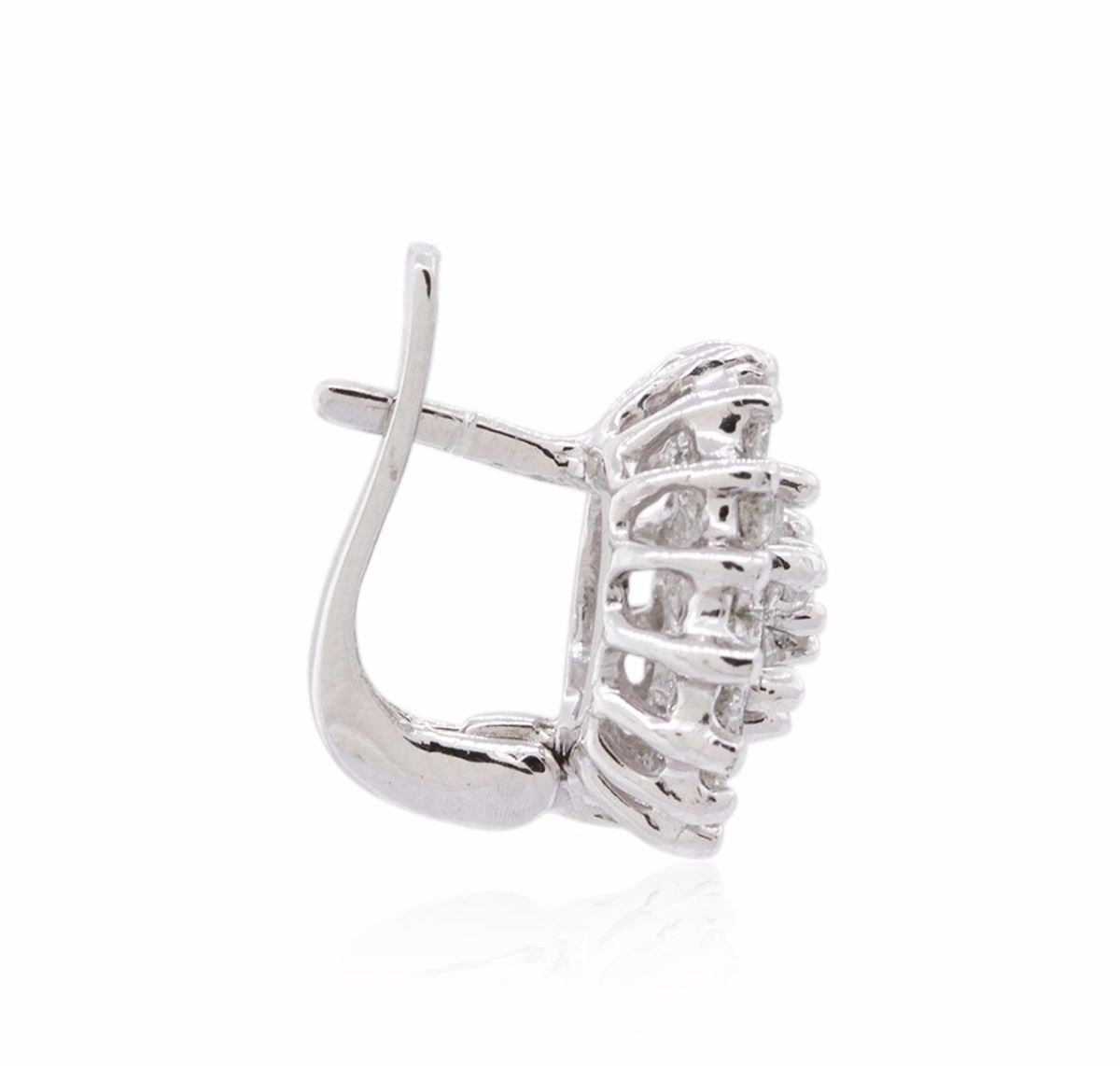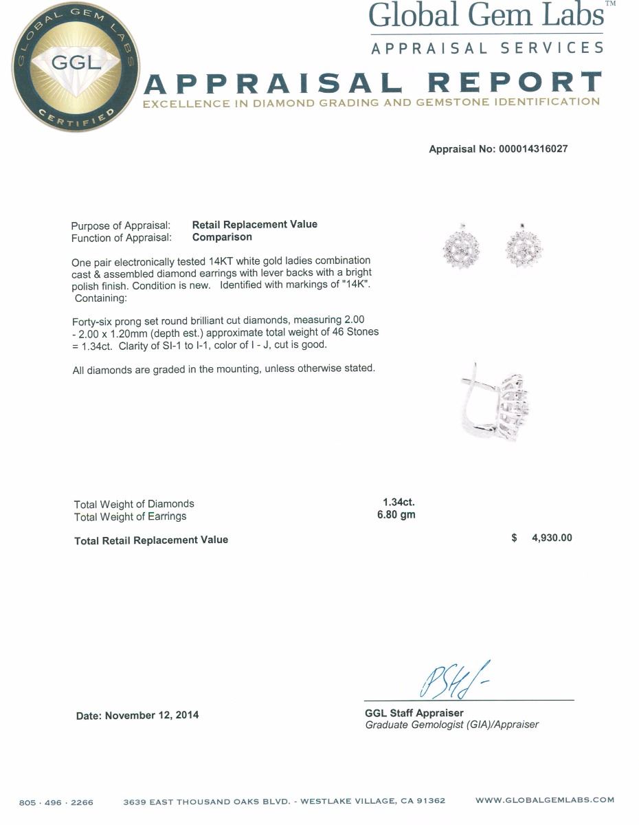 One pair electronically tested 14KT white gold ladies combination cast & assembled diamond earrings with lever backs with a bright polish finish. Identified with markings of "14K". Condition is new. Containing: Forty-Six prong set round brilliant cut diamonds, measuring 2.00 - 2.00 x 1.20mm (depth est.) approximate total weight of 46 Stones = 1.34ct. Clarity: SI-1 to I-1. Color: I - J, Cut is Good. All diamonds are graded in the mounting, unless otherwise stated. Total Weight of Diamonds 1.34ct. Total Weight of Earrings 6.80 grams. GGL Appraised at $4,930.00.