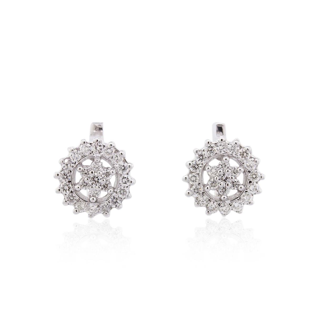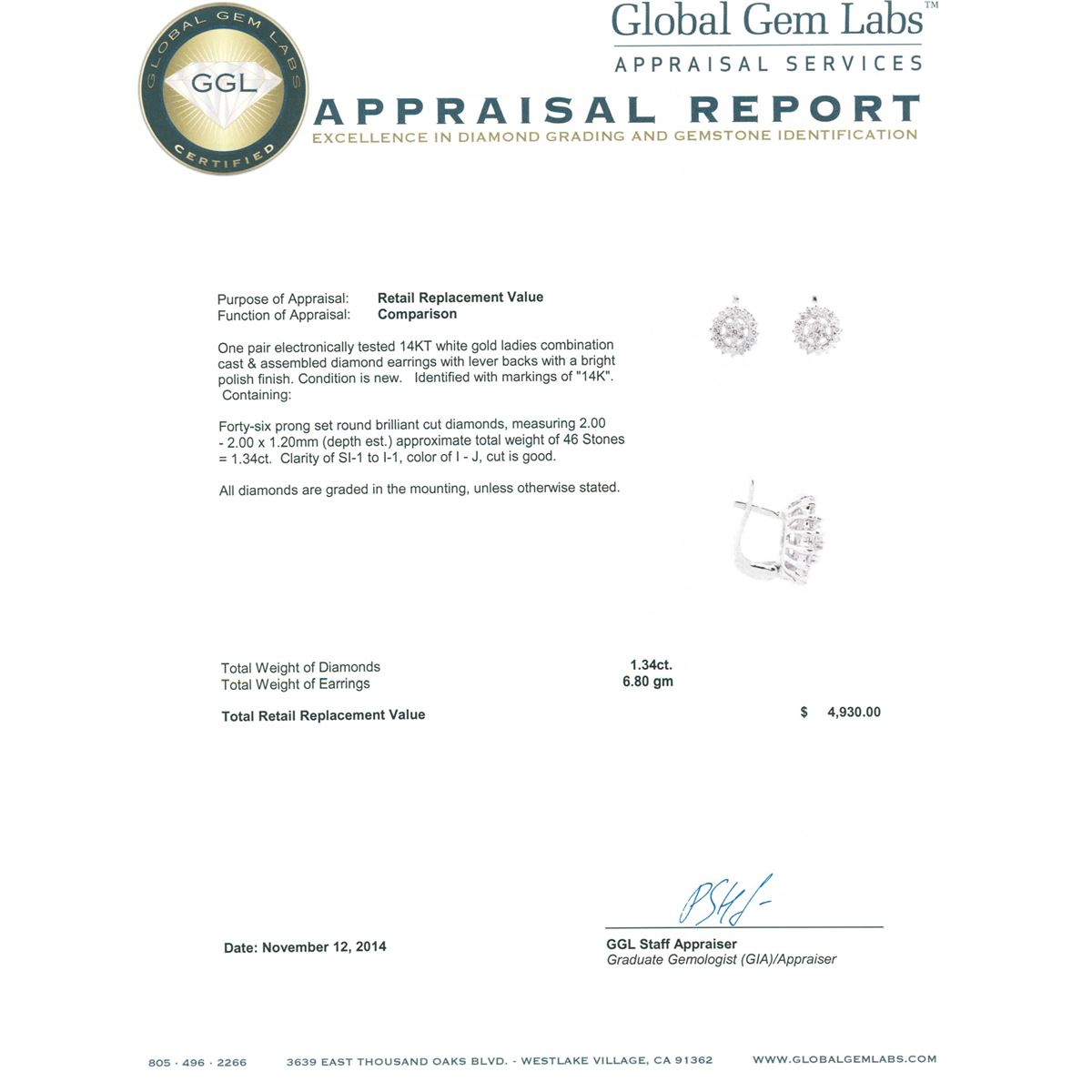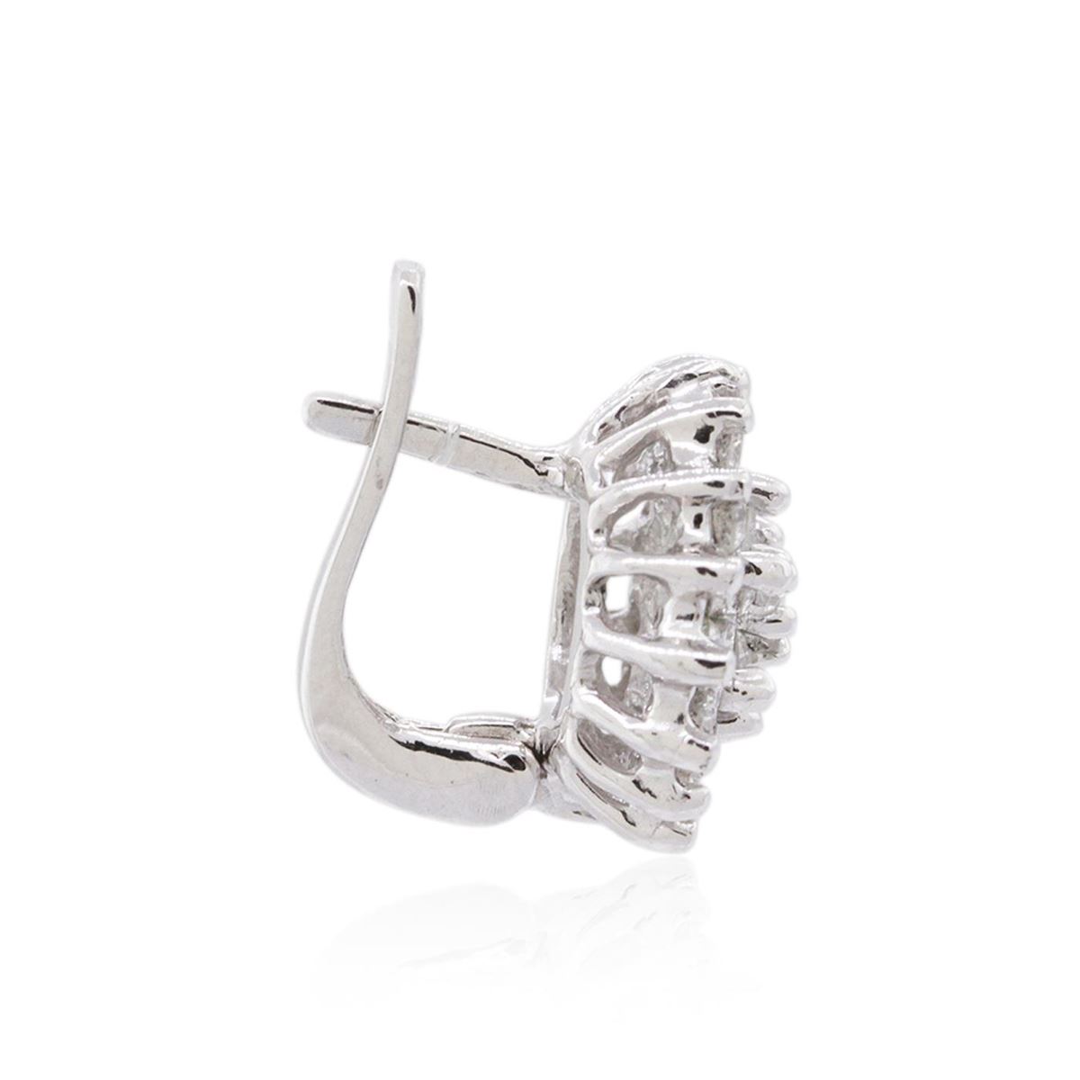 One pair electronically tested 14KT white gold ladies combination cast & assembled diamond earrings with lever backs with a bright polish finish. Identified with markings of "14K". Condition is new. Containing: Forty-Six prong set round brilliant cut diamonds, measuring 2.00 - 2.00 x 1.20mm (depth est.) approximate total weight of 46 Stones = 1.34ct. Clarity: SI-1 to I-1. Color: I - J, Cut is Good. All diamonds are graded in the mounting, unless otherwise stated. Total Weight of Diamonds 1.34ct. Total Weight of Earrings 6.80 grams. GGL Appraised at $4,930.00.
