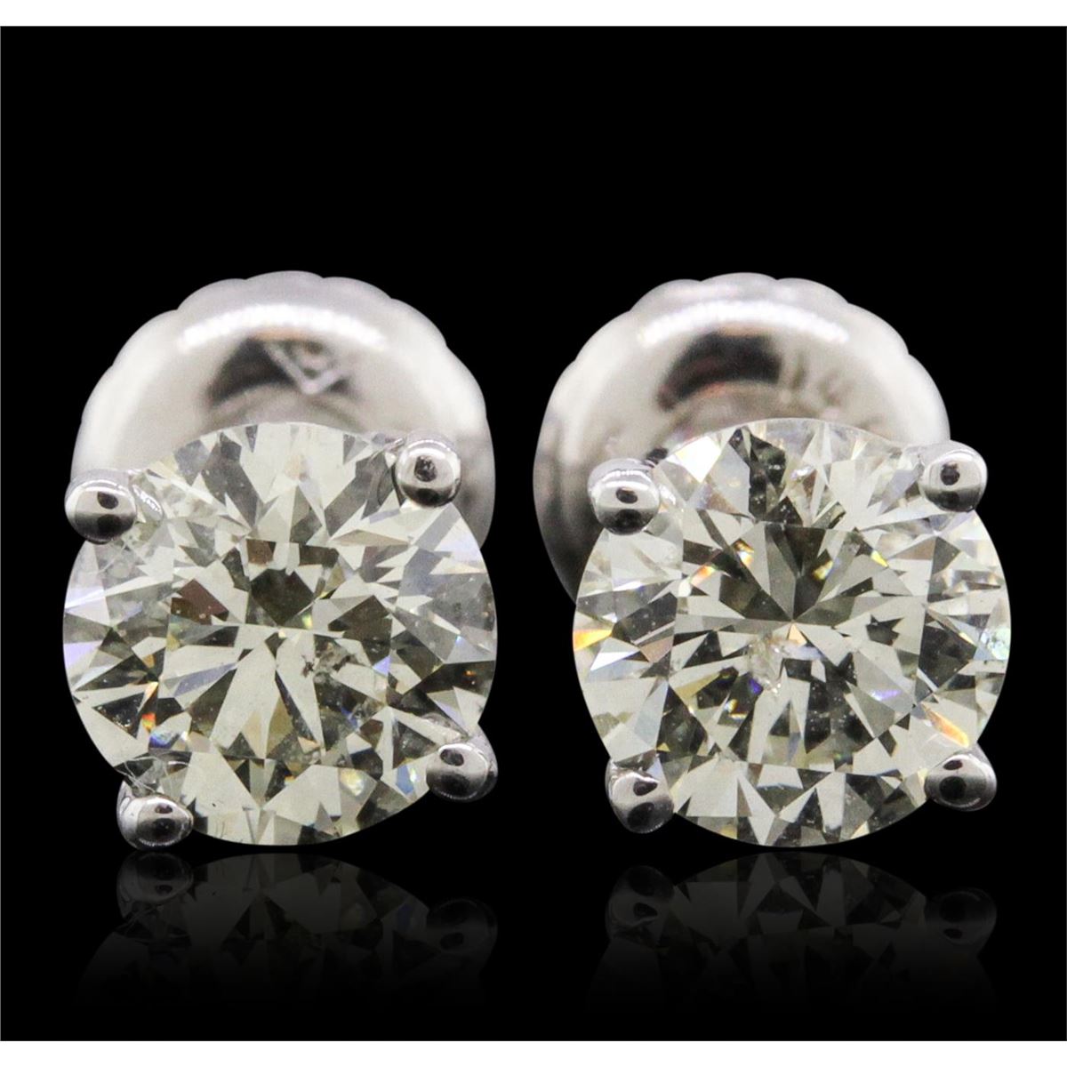 One pair electronically tested 14KT white gold cast & assembled diamond solitaire earrings with screw backs. Bright polish finish. Condition is new, good workmanship. Containing: One prong set round brilliant cut diamond, measuring 5.38 - 5.37 x 3.23mm (depth est.) approximate weight of 0.67ct with a faint blue fluorescence. Graded in the setting. Clarity: I-1. Depth: 60.0%. Table 63.2%. One prong set round brilliant cut diamond, measuring 5.30 - 5.29 x 3.35mm (depth est.) approximate weight of 0.67ct with a strong blue fluorescence. Graded in the setting. Clarity: SI-2. Depth: 63.2%. Table 57.6%. Total Weight of Diamonds 1.34ct. Total Weight of Earrings 0.98 grams. AIG Appraised at $4,455.00.