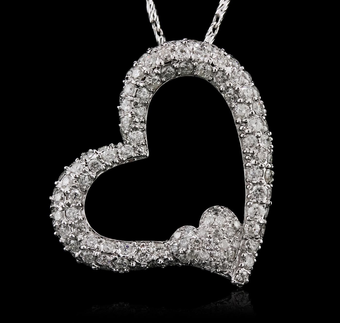 One electronically tested 14KT white gold ladies cast & assembled diamond " heart " pendant with chain. The pendant is completed by an eighteen inch 14KT white gold designer style chain, terminating in a lobster clasp. Bright polish finish Condition is new, good workmanship. Containing: One Hundred Eleven bead set round brilliant cut diamonds, measuring 1.60 - 1.30 x 0.87mm (depth est.) approximate total weight of 111 Stones = 1.35ct. The below listed clarity & color grade reflect an overall range for the group. Graded in the setting. Clarity: SI-1 to I-2. Color: F - I. Total Weight of Diamonds 1.35ct. Total Weight of Pendant With Chain 7.74 grams. AIG Appraised.