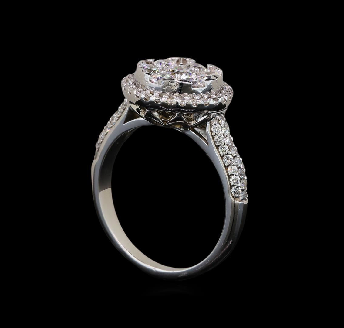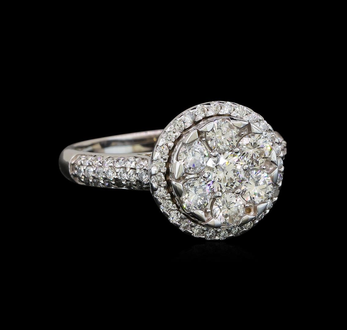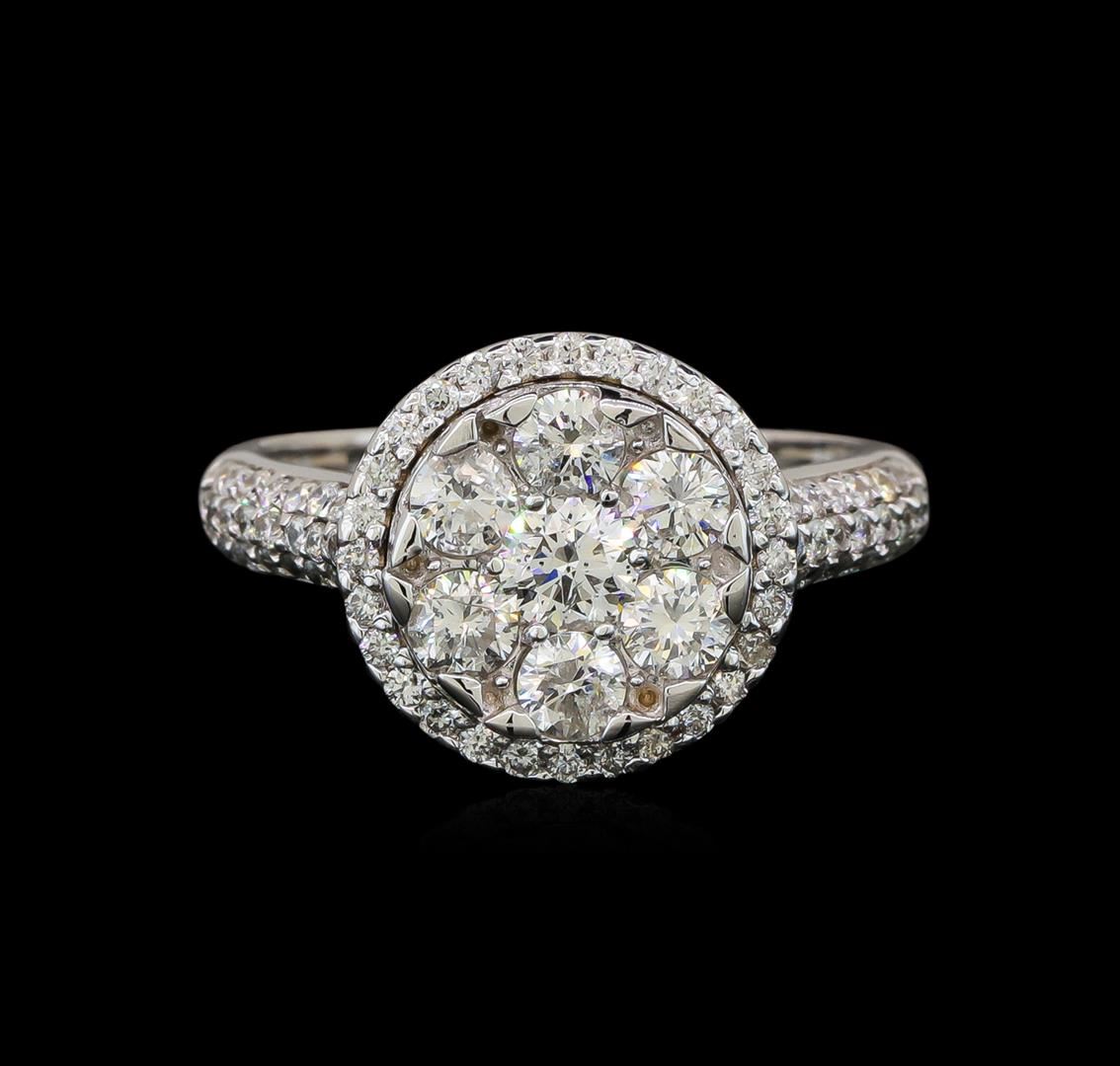 One electronically tested 14KT white gold ladies cast diamond ring with a cathedral shank with a bright polish finish. Identified with markings of "K14". Condition is new. Containing: One prong set round brilliant cut diamond, measuring 4.00 - 4.00 x 2.40mm (depth est.) approximate weight of 0.22ct. Clarity: SI-2. Color: I, Cut is Good. Six prong set round brilliant cut diamonds, measuring 2.90 - 2.90 x 1.74mm (depth est.) approximate total weight of 6 Stones = 0.54ct. Clarity: SI-1 to SI-2. Color: I - J, Cut is Good. Seventy-Seven prong set round brilliant cut diamonds, measuring 1.10 - 1.10 x 0.66mm (depth est.) approximate total weight of 77 Stones = 0.59ct. Clarity: SI-2 to I-1. Color: H - I, Cut is Good. All diamonds are graded in the mounting, unless otherwise stated. Total Weight of Diamonds 1.35ct. Total Weight of Ring 5.60 grams. GGL Appraised at $5,735.00.