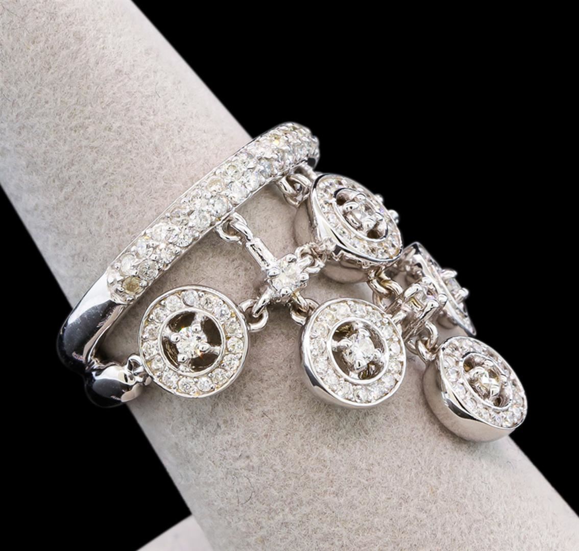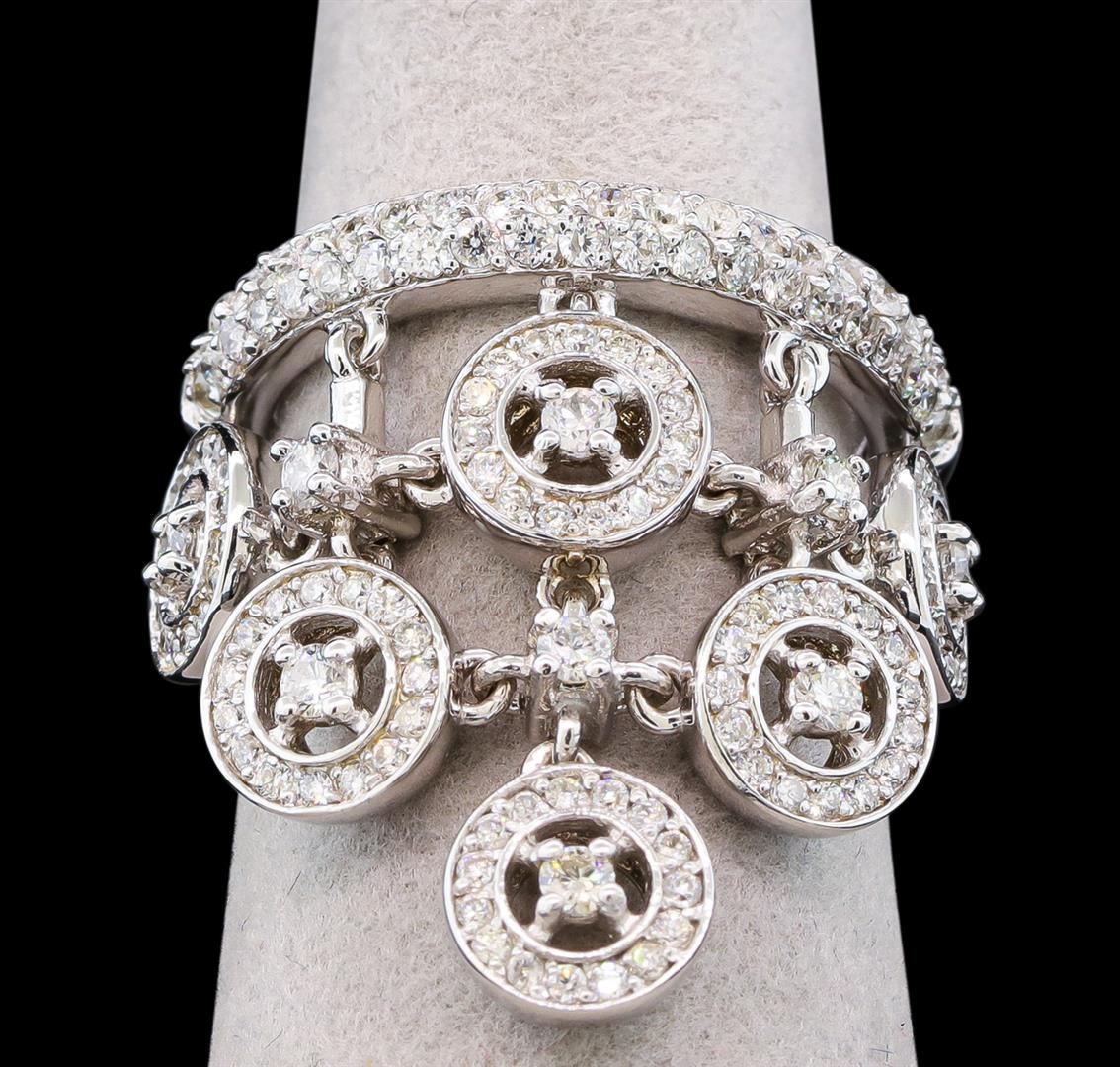 One electronically tested 14KT white gold ladies cast diamond ring with a bright polish finish. Identified with markings of "14K". Condition is new. Containing: Nine prong set round brilliant cut diamonds, measuring 2.00 - 2.00 x 1.20mm (depth est.) approximate total weight of 9 Stones = 0.26ct. Clarity: SI-1. Color: I - J, Cut is Good. One Hundred Thirty-Six prong set round brilliant cut diamonds, measuring 1.40 - 1.20 x 0.78mm (depth est.) approximate total weight of 136 Stones = 1.09ct. Clarity: SI-2 to I-1. Color: I - J, Cut is Good. All diamonds are graded in the mounting, unless otherwise stated. Total Weight of Diamonds 1.35ct. Total Weight of Ring 11.10 grams. GGL Appraised at $4,730.00.