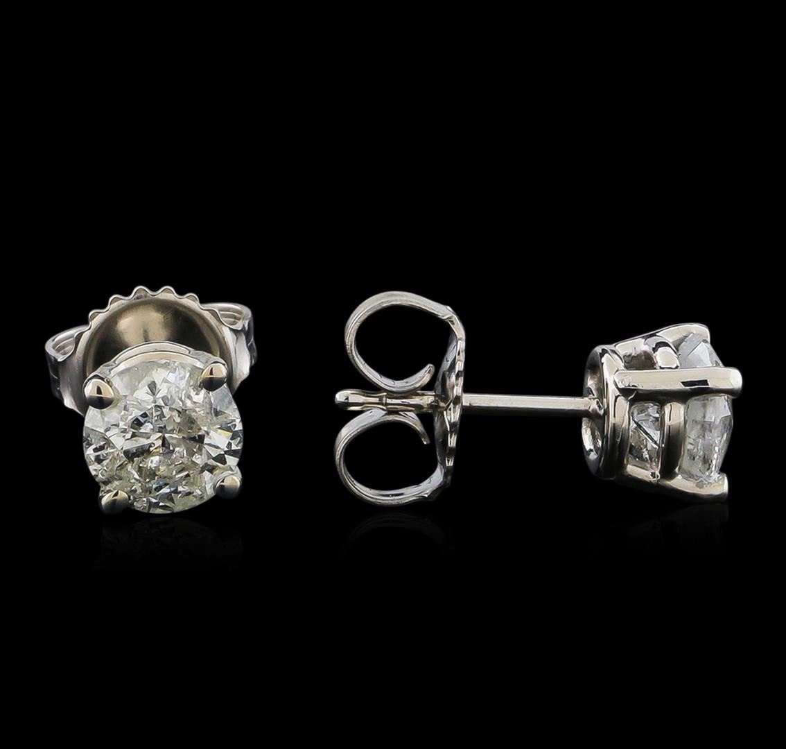 One pair electronically tested 14KT white gold ladies cast stud earrings with friction posts with a bright polish finish. Identified with markings of "14K". Condition is new. Containing: One prong set round brilliant cut diamond, measuring 5.72 - 5.63 x 3.41mm (depth est.) approximate weight of 0.67ct. Clarity: I-3. Color: I, Cut is Good. One prong set round brilliant cut diamond, measuring 5.68 - 5.71 x 3.42mm (depth est.) approximate weight of 0.68ct. Clarity: I-3. Color: I, Cut is Good. All diamonds are graded in the mounting, unless otherwise stated total weight of Diamonds 1.35ct. Total Weight of Earrings 1.60 grams. GGL Appraised at $4,780.00.