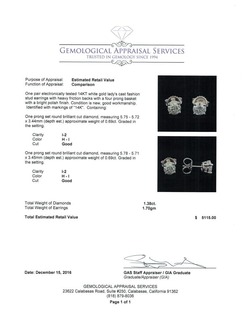 One pair electronically tested 14KT white gold ladies cast stud earrings with friction posts with a bright polish finish. Identified with markings of "14K". Condition is new. Containing: One prong set round brilliant cut diamond, measuring 5.72 - 5.63 x 3.41mm (depth est.) approximate weight of 0.67ct. Clarity: I-3. Color: I, Cut is Good. One prong set round brilliant cut diamond, measuring 5.68 - 5.71 x 3.42mm (depth est.) approximate weight of 0.68ct. Clarity: I-3. Color: I, Cut is Good. All diamonds are graded in the mounting, unless otherwise stated total weight of Diamonds 1.35ct. Total Weight of Earrings 1.60 grams. GGL Appraised at $4,780.00.