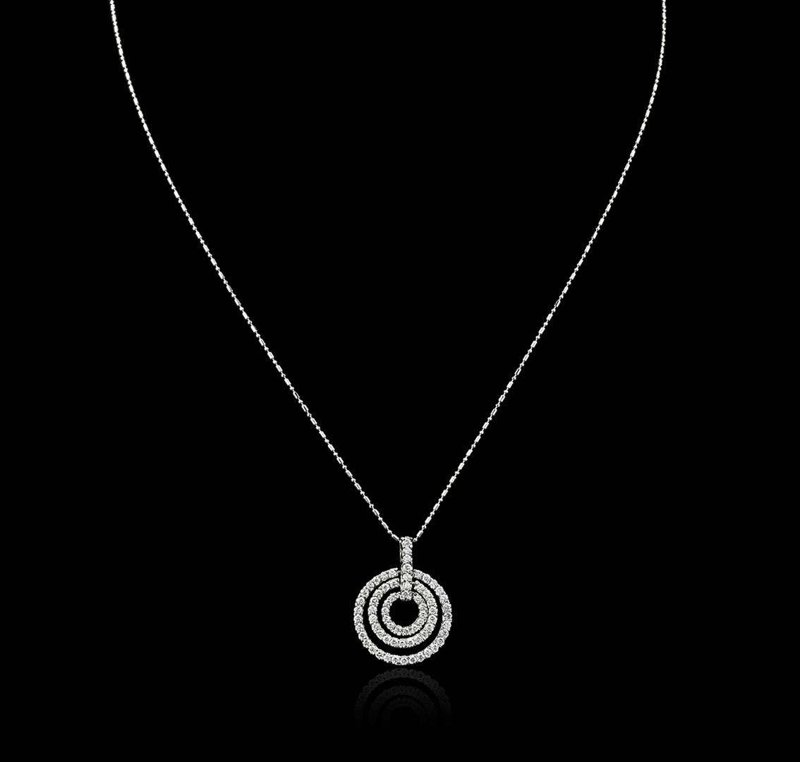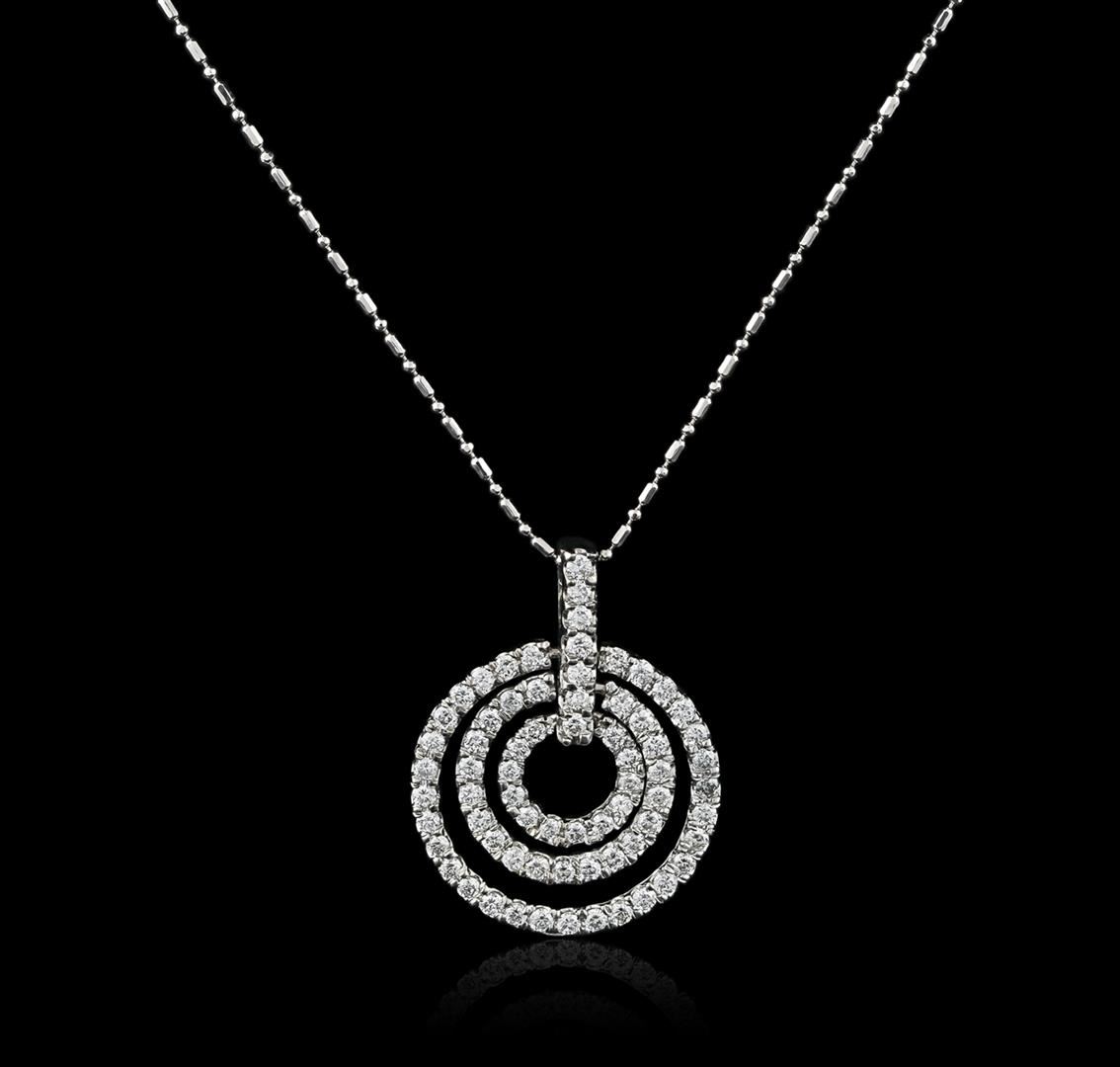 One electronically tested 14KT white gold ladies cast diamond pendant & chain 18.0" long, with a spring ring clasp with a bright polish finish. Identified with markings of "14K". Condition is new. Containing: Sixty-Nine prong set round brilliant cut diamonds, measuring 1.80 - 1.50 x 0.99mm (depth est.) approximate total weight of 69 Stones = 1.35ct. Clarity: SI-1 to I-1. Color: H - I, Cut is Good. All diamonds are graded in the mounting, unless otherwise stated. Total Weight of Diamonds 1.35ct. Total Weight of Pendant & Chain 6.70 grams. GGL Appraised at $3,465.00.