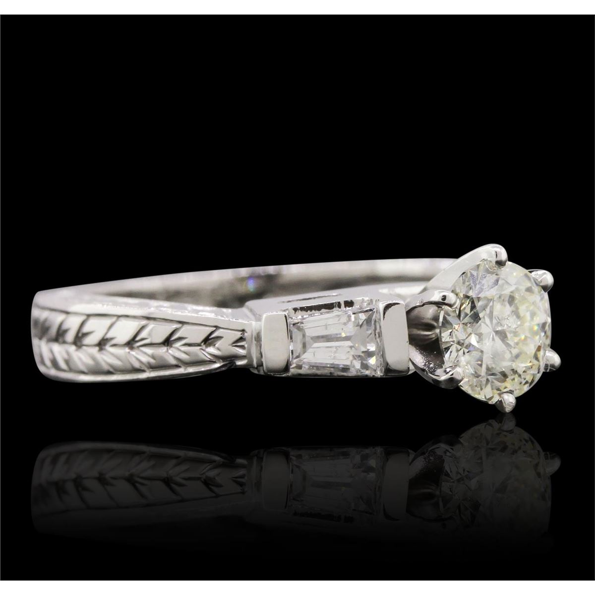 One electronically tested 14KT white gold ladies cast diamond unity ring with a bright polish finish. Condition is new, good workmanship. The featured diamond is accented by a single diamond on either side supported by patterned shoulders, completed by a two and one-half millimeter wide band. Identified with markings of "14K". Containing: One prong set round brilliant cut diamond, measuring 5.95 - 5.90 x 4.00mm (depth est.) approximate weight of 0.96ct. Graded in the setting. Clarity: I-1 . Color: 67.5%. Table 59.0%. Two channel set baguette cut (tapered) diamonds, measuring from 4.50 x 2.50 x 1.75mm (depth est.) to 4.60 x 2.70 x 1.89mm (depth est.) approximate. Total Weight of 2 Stones = 0.39ct. Color & clarity grade are an average for the pair. Graded in the setting. Clarity: SI-2 . Color: H. Total Weight of Diamonds 1.35ct.. Total Weight of Ring 5.94 grams. AIG Appraised at $11,335.00.