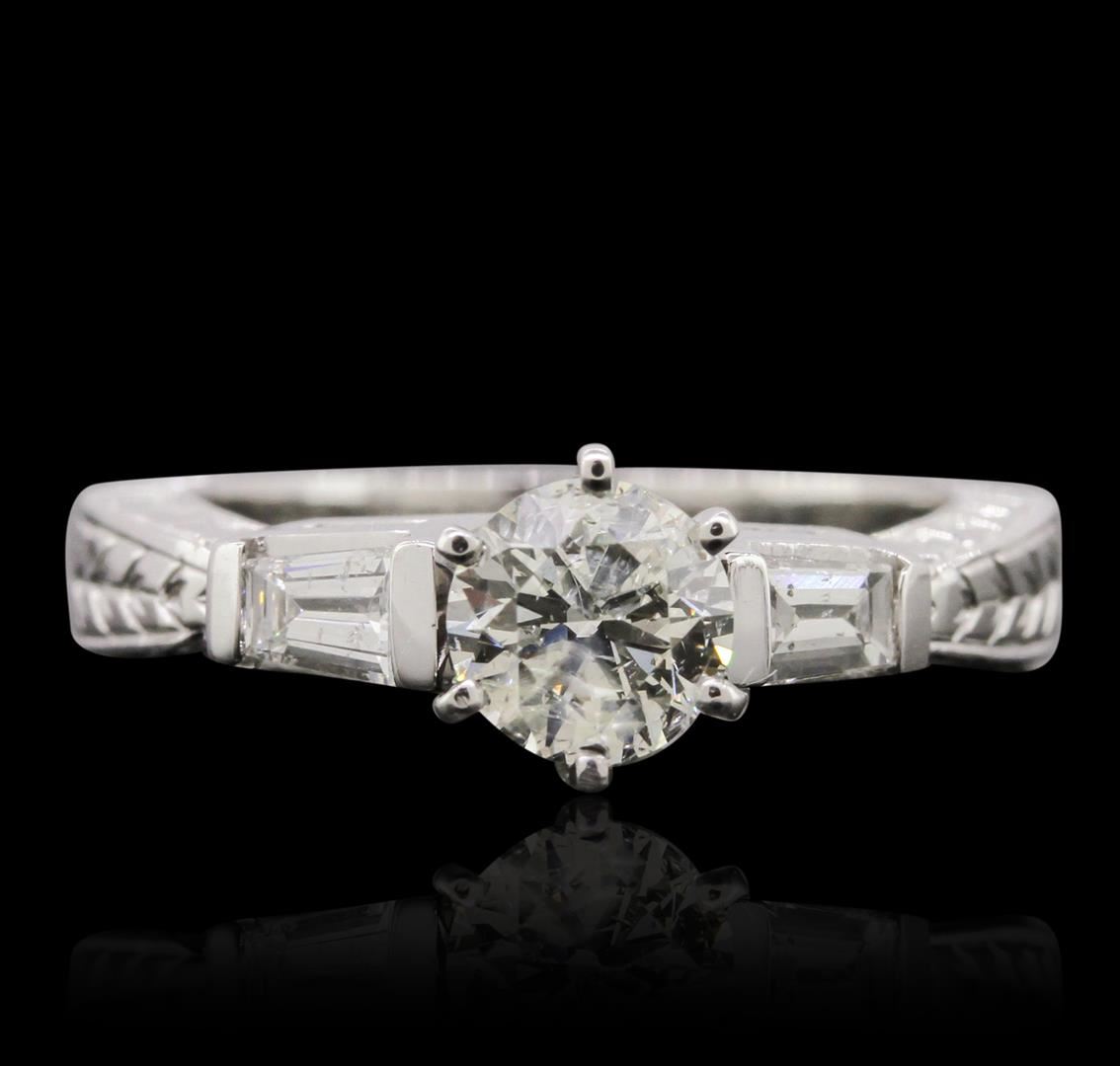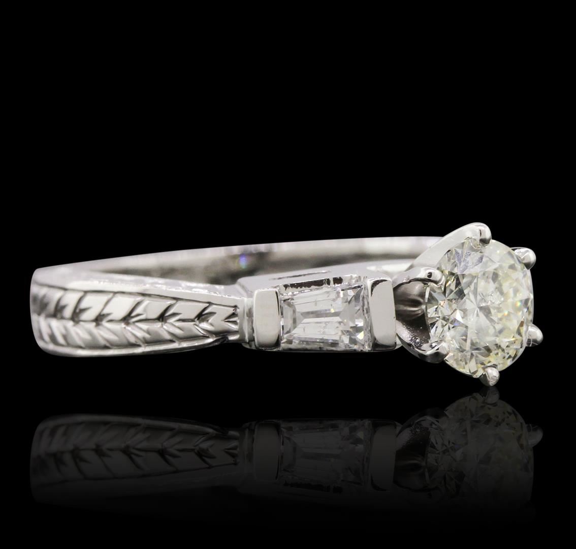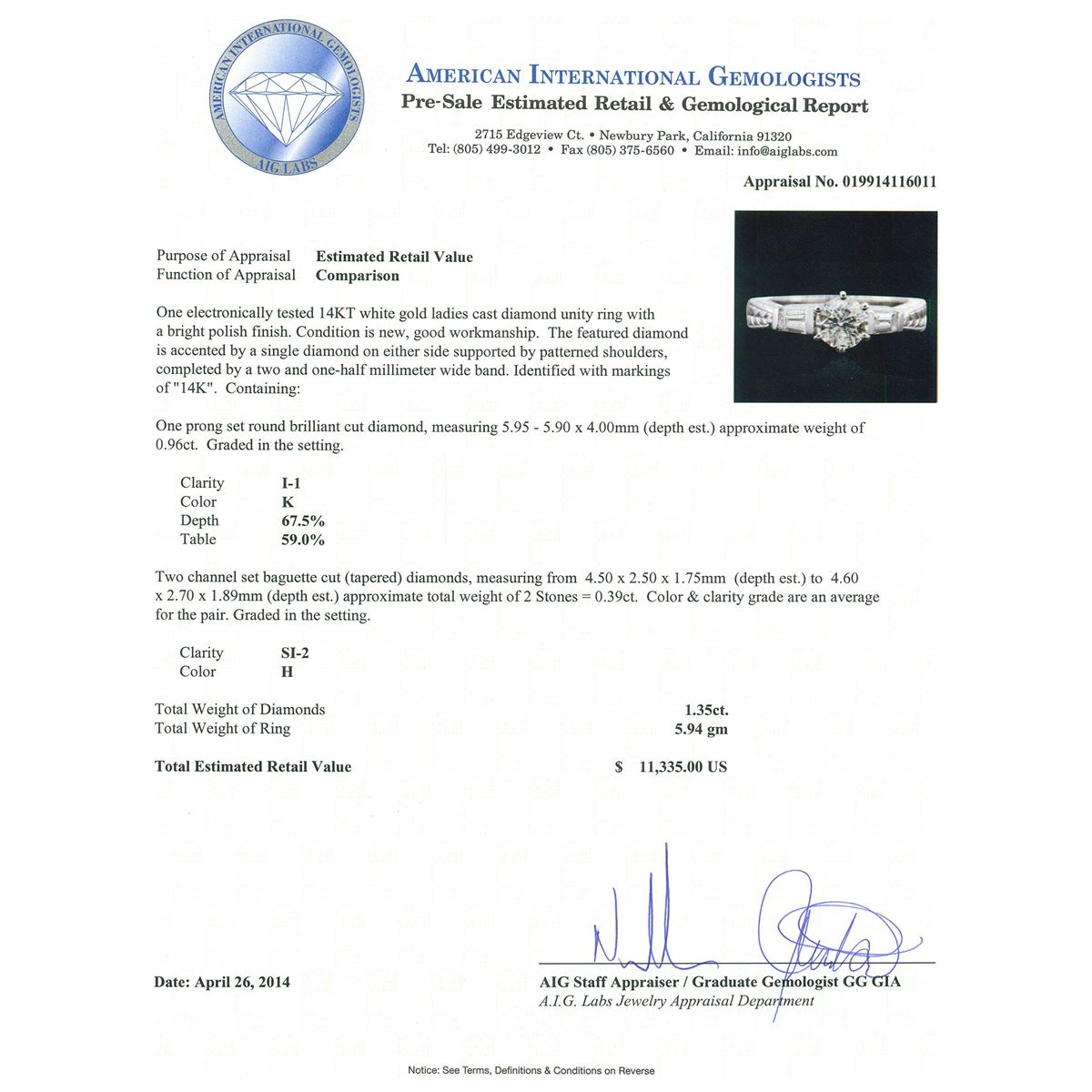 One electronically tested 14KT white gold ladies cast diamond unity ring with a bright polish finish. Condition is new, good workmanship. The featured diamond is accented by a single diamond on either side supported by patterned shoulders, completed by a two and one-half millimeter wide band. Identified with markings of "14K". Containing: One prong set round brilliant cut diamond, measuring 5.95 - 5.90 x 4.00mm (depth est.) approximate weight of 0.96ct. Graded in the setting. Clarity: I-1 . Color: 67.5%. Table 59.0%. Two channel set baguette cut (tapered) diamonds, measuring from 4.50 x 2.50 x 1.75mm (depth est.) to 4.60 x 2.70 x 1.89mm (depth est.) approximate. Total Weight of 2 Stones = 0.39ct. Color & clarity grade are an average for the pair. Graded in the setting. Clarity: SI-2 . Color: H. Total Weight of Diamonds 1.35ct.. Total Weight of Ring 5.94 grams. AIG Appraised at $11,335.00.