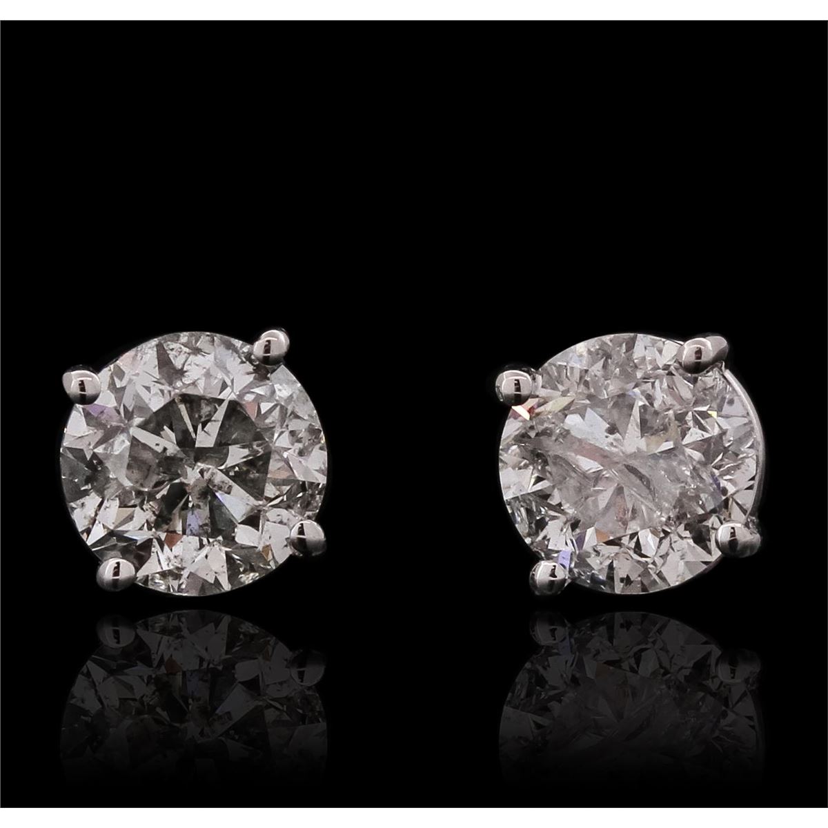 One pair electronically tested 14KT white gold cast & assembled diamond solitaire earrings with screw backs. Condition is new, good workmanship. Containing: One prong set round brilliant cut diamond, measuring 5.40 - 5.30 x 3.75mm (depth est.), 5.00% GTCF approximate weight of 0.68ct. Graded in the setting. Clarity: I-1. Color: I. Depth 70.1%. Table 56.1%. One prong set round brilliant cut diamond, measuring 5.28 - 5.27 x 3.65mm (depth est.), 8.00% GTCF approximate weight of 0.67ct. Graded in the setting. Clarity: I-2. Color: I. Depth 69.1%. Table 55.9%. Total Weight of Diamonds 1.35ct. Total Weight of Earrings 0.82 grams. AIG Appraised at $5,200.00.