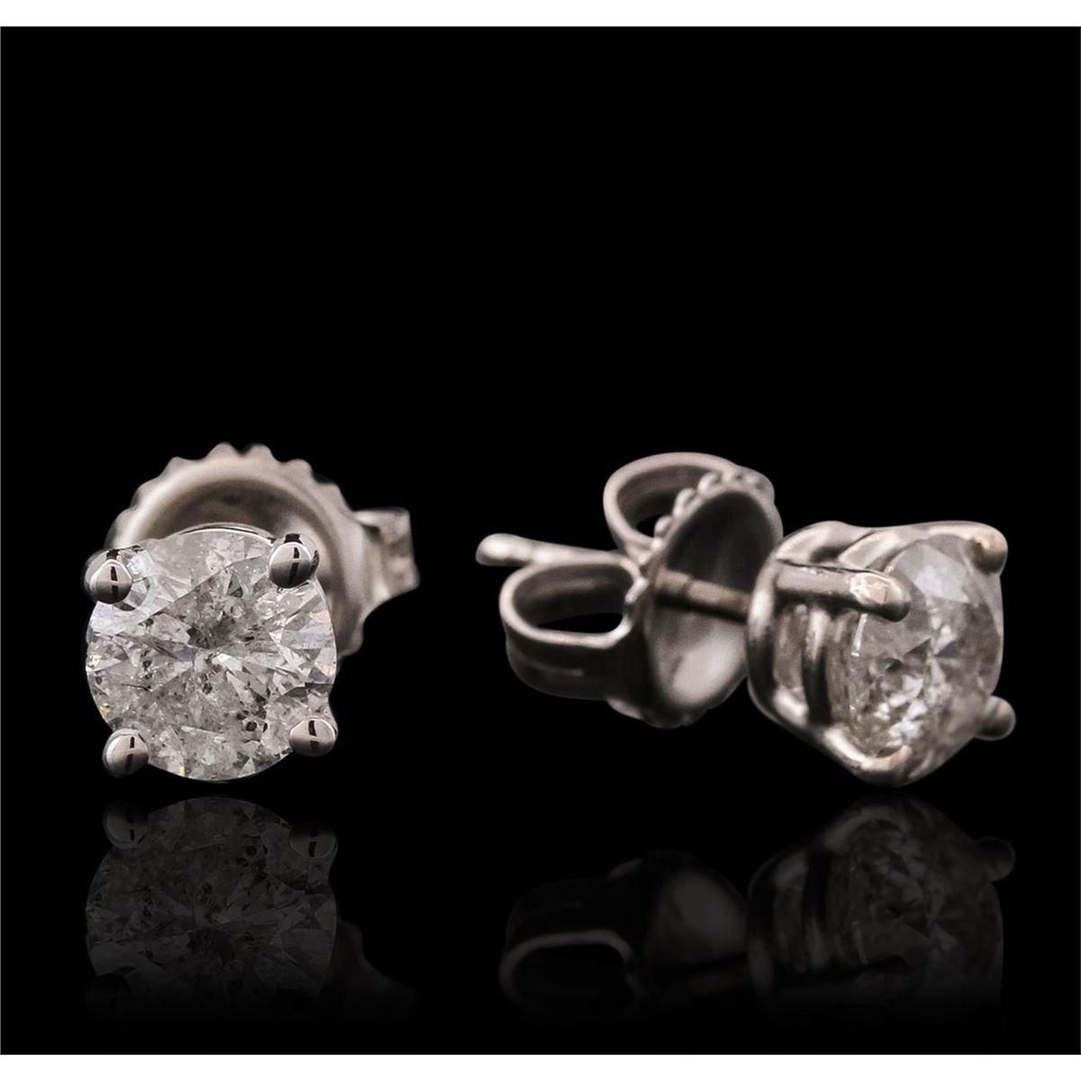 One pair electronically tested 14KT white gold ladies cast stud earrings with friction posts with a bright polish finish. Identified with markings of "14K". Condition is new. Containing: One prong set round brilliant cut diamond, measuring 5.72 - 5.63 x 3.41mm (depth est.) approximate weight of 0.67ct. Clarity: I-3. Color: I, Cut is Good. One prong set round brilliant cut diamond, measuring 5.68 - 5.71 x 3.42mm (depth est.) approximate weight of 0.68ct. Clarity: I-3. Color: I, Cut is Good. All diamonds are graded in the mounting, unless otherwise stated total weight of Diamonds 1.35ct. Total Weight of Earrings 1.60 grams. GGL Appraised at $4,780.00.